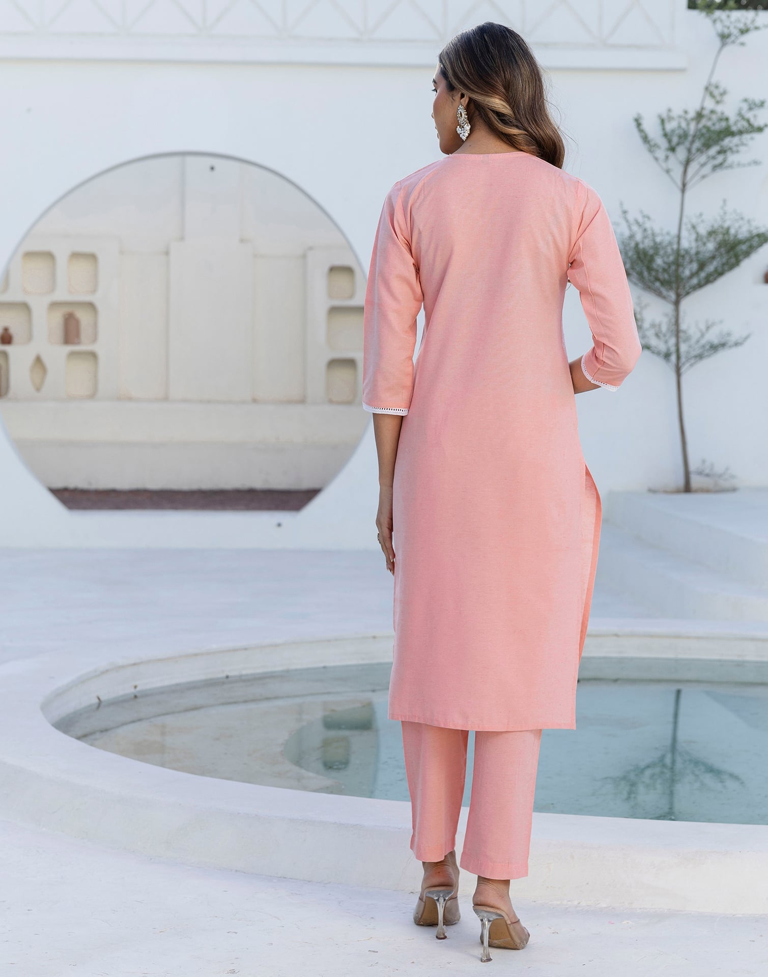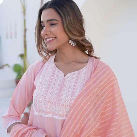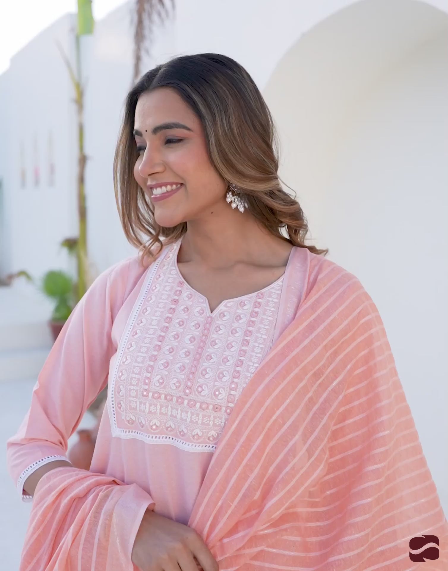 Crafted in Cotton with exquisite Embroidered, this Pink kurta set is an essential for your ethnic wardrobe. The kurta comes with a Keyhole Neck, paired with Pant and dupatta for a complete look. Ideal for Festive Wear, it ensures all-day comfort and lightweight fabric. A perfect choice for festive wear and traditional outfit lovers. Festive Wear, Graceful Silhouette, Indian Wear.