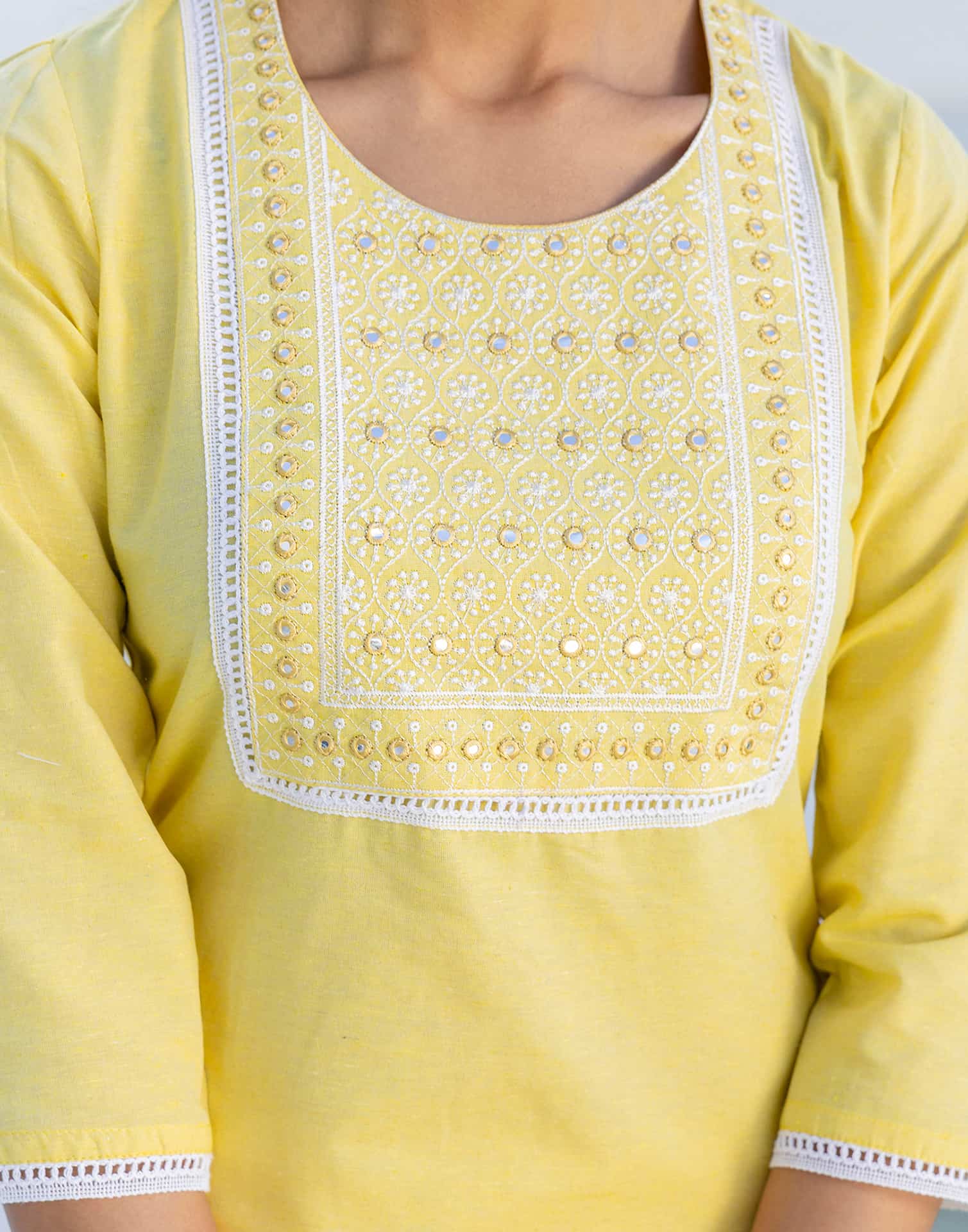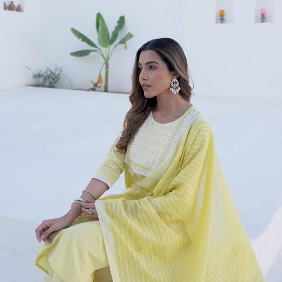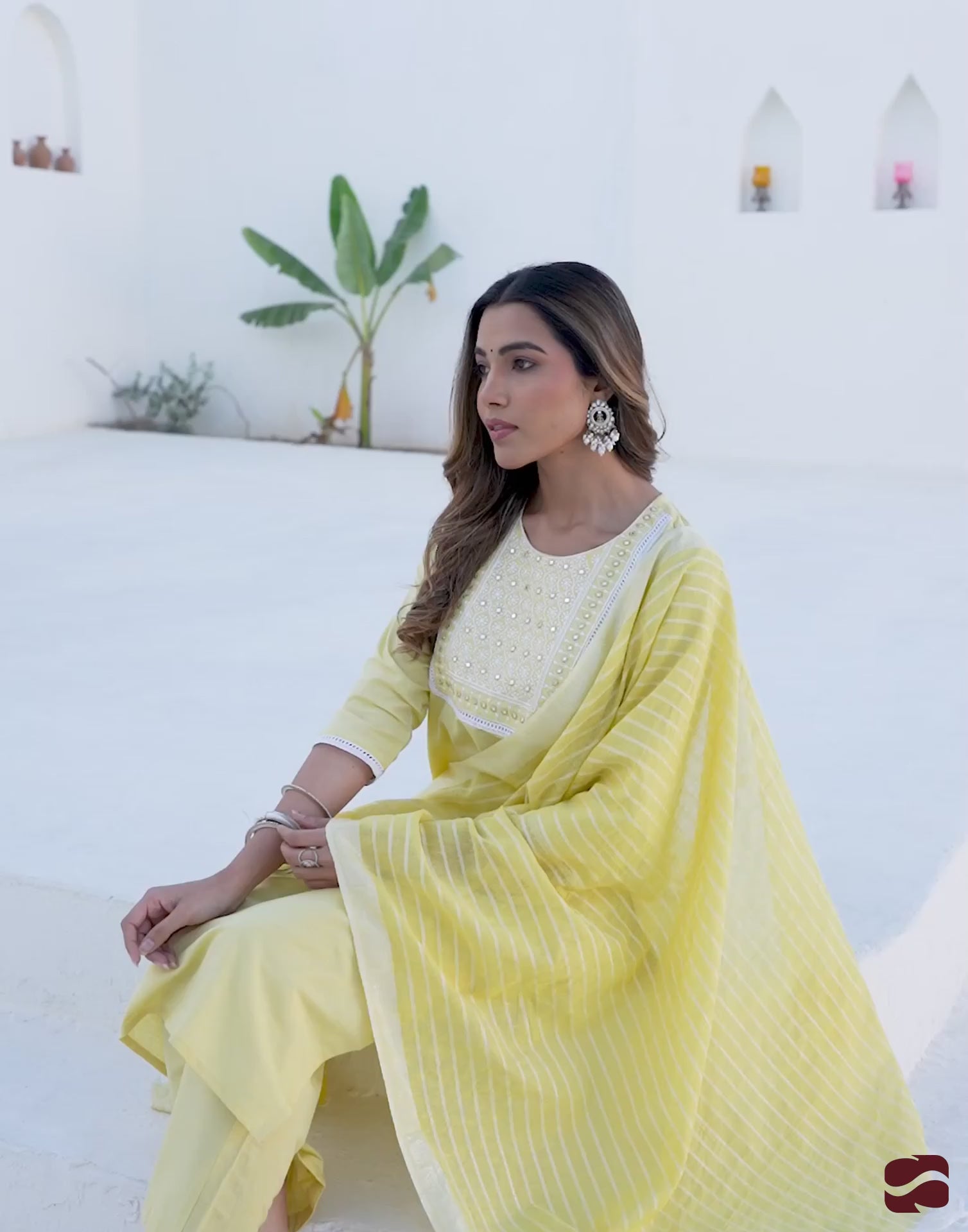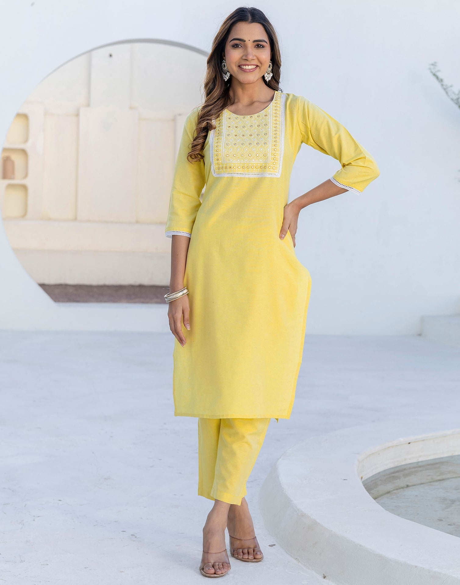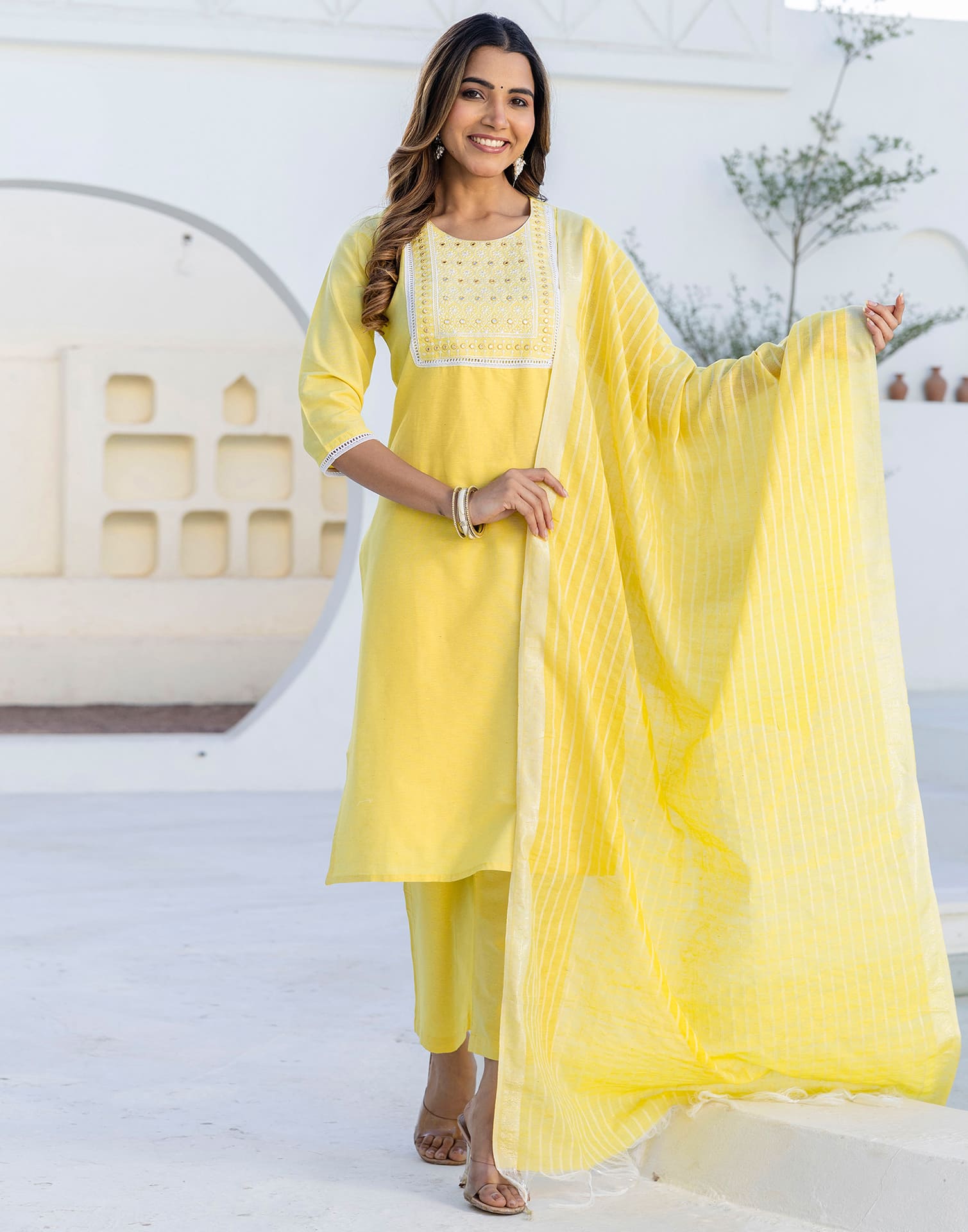 Crafted in Cotton with exquisite Embroidered, this Yellow kurta set is an essential for your ethnic wardrobe. The kurta comes with a Round Neck, paired with Pant and dupatta for a complete look. Ideal for Festive Wear, it ensures all-day comfort and high-quality fabric. A perfect choice for festive wear and traditional outfit lovers. Comfortable Fit, Comfortable Wear, Easy to Maintain.