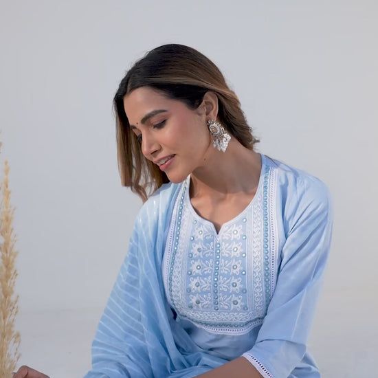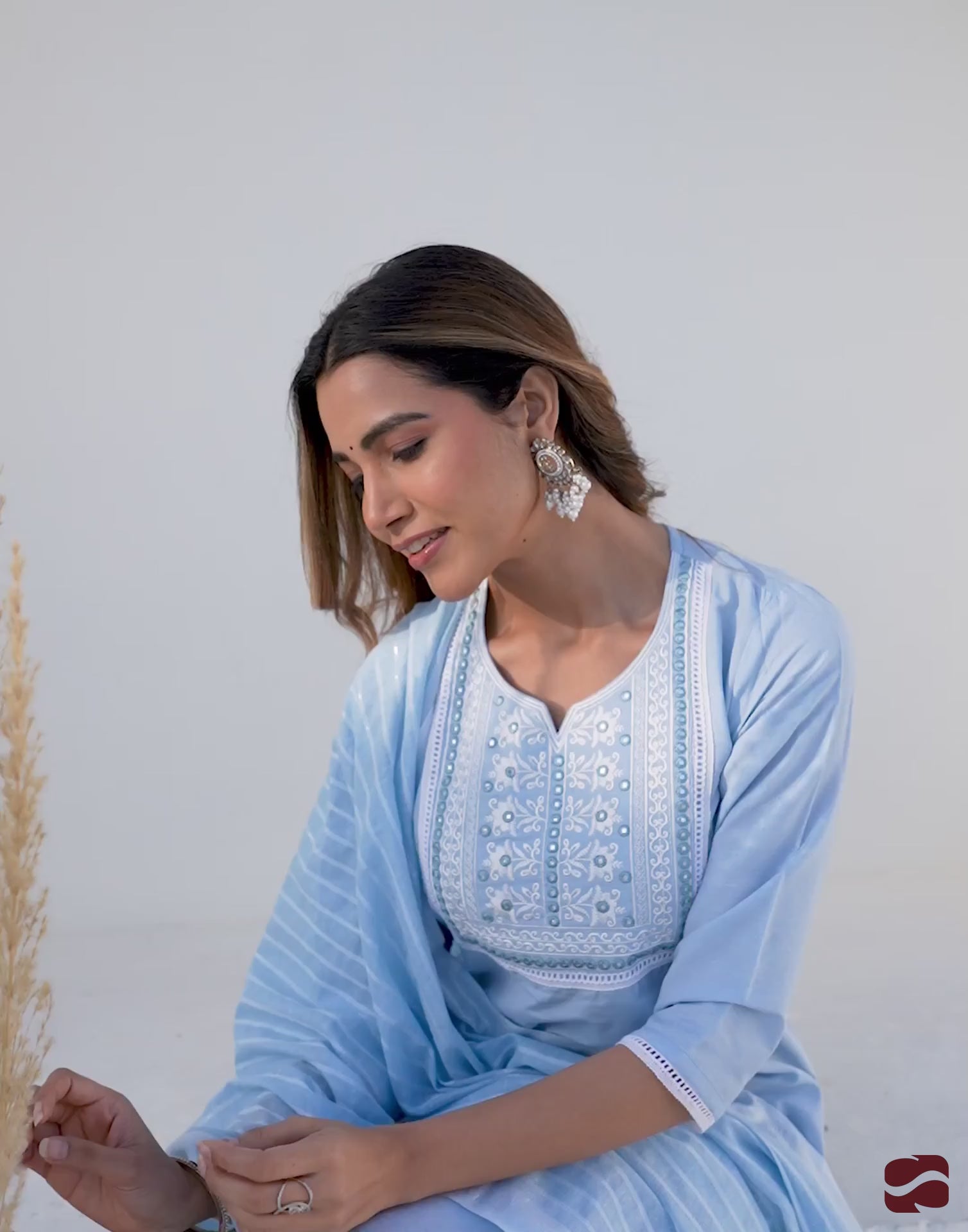 Refresh your ethnic collection with this Cotton kurta set in Blue. Highlighted by Embroidered and styled with a Keyhole Neck, the kurta blends comfort with tradition. Teamed with Pant and dupatta, this outfit is perfect for Festive Wear. It guarantees all-day comfort, lightweight fabric, and the ease of an everyday ethnic wear. Casual Wear, Ease of Movement, Made in India.
