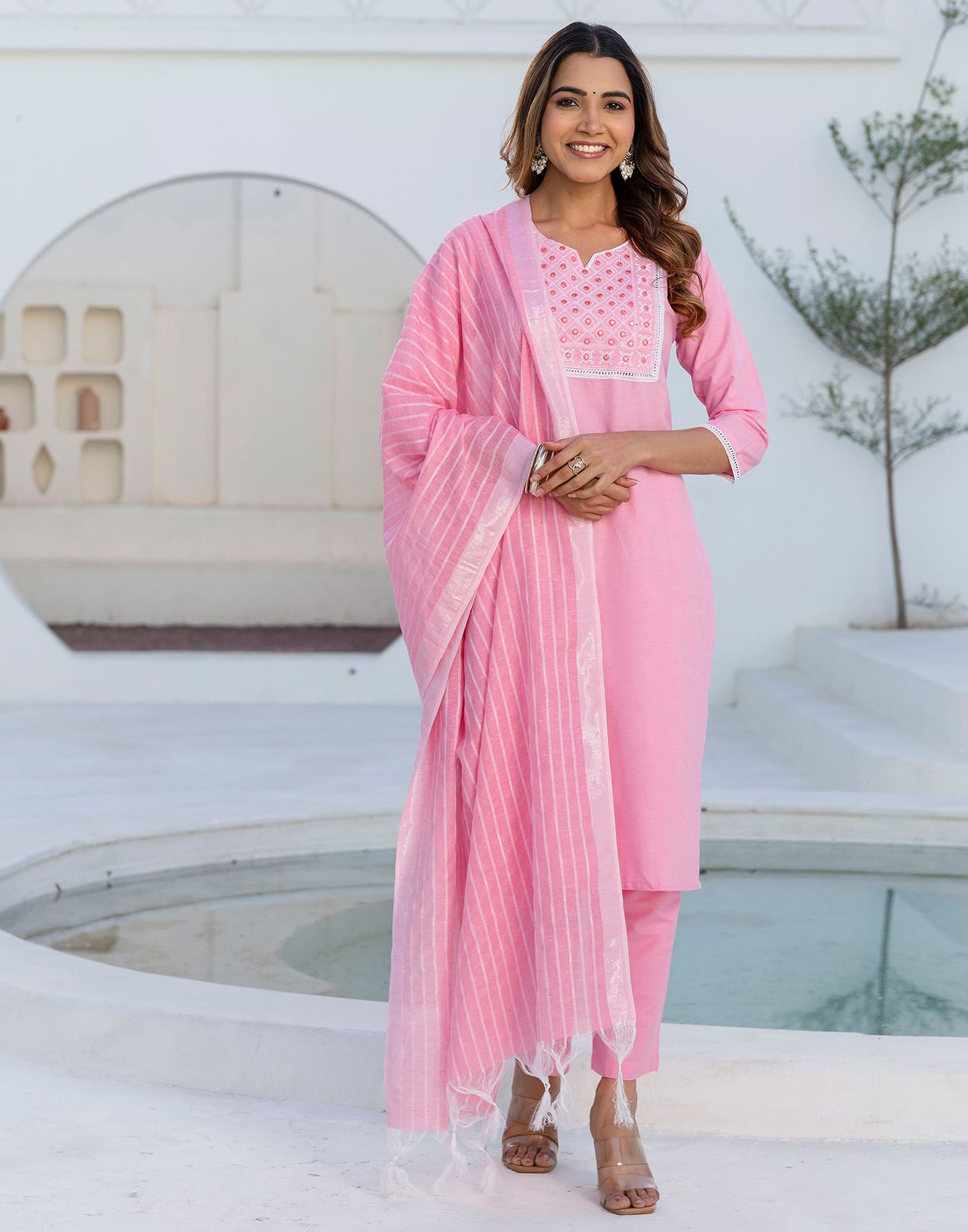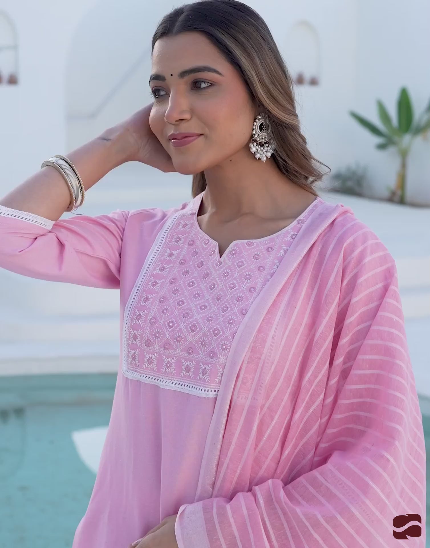 This Pink Cotton kurta set is beautifully designed with Embroidered. The kurta features a Keyhole Neck and a graceful silhouette for an elegant appeal. It is paired with Pant and a matching dupatta, making it a complete kurta set. Perfect for Festive Wear, this ethnic wear for women offers soft & breathable fabric, ease of movement, and timeless charm. Comfortable Wear, Kurta with Pant & Dupatta, Indian Wear.