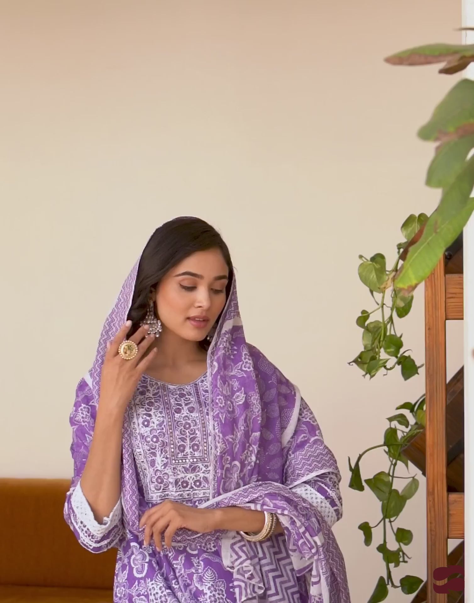 Crafted in Cotton with exquisite Embroidery And Sequin Work, this Purple kurta set is an essential for your ethnic wardrobe. The kurta comes with a Round Neck, paired with Pant and dupatta for a complete look. Ideal for Festive Wear, it ensures comfortable wear and premium fabric. A perfect choice for festive wear and traditional outfit lovers. All-day Comfort, Graceful Silhouette, Comfortable Fit.