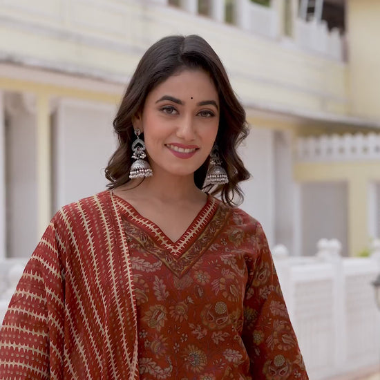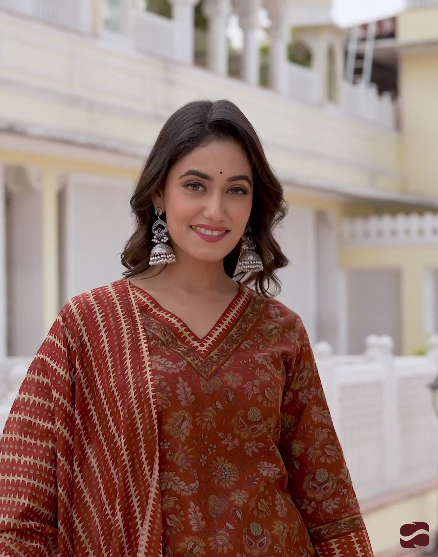 Elevate your ethnic wardrobe with this Cotton kurta set in Brown. Designed with Printed and a V-Neck, the kurta offers a comfortable fit and stylish finish. The set includes Pant and a dupatta, completing the look. Suitable for Casual Wear, it combines premium fabric, ease of movement, and modern design. Traditional Outfit, Premium Fabric, Traditional Occasion Outfit.