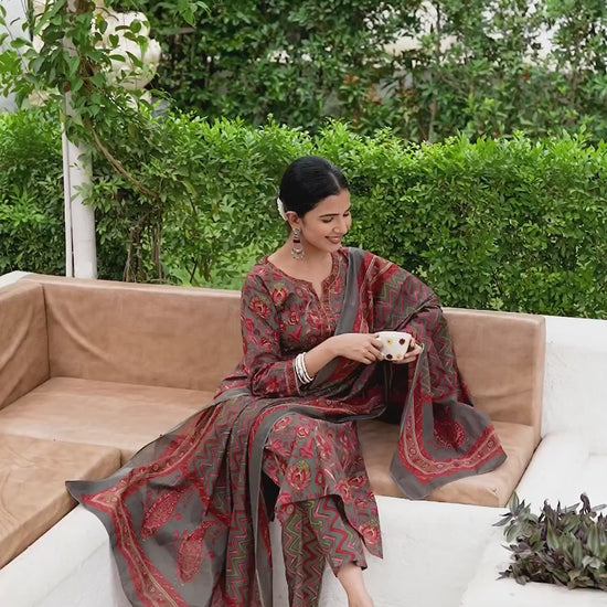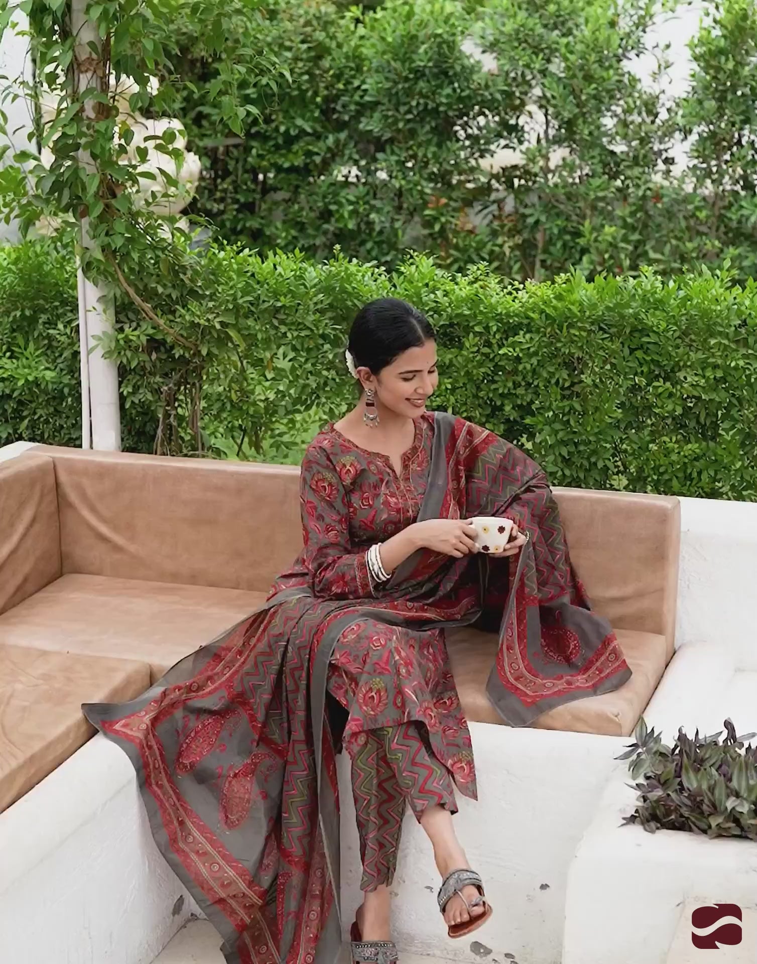 Cotton Printed A-Line Kurta with Pant & Dupatta