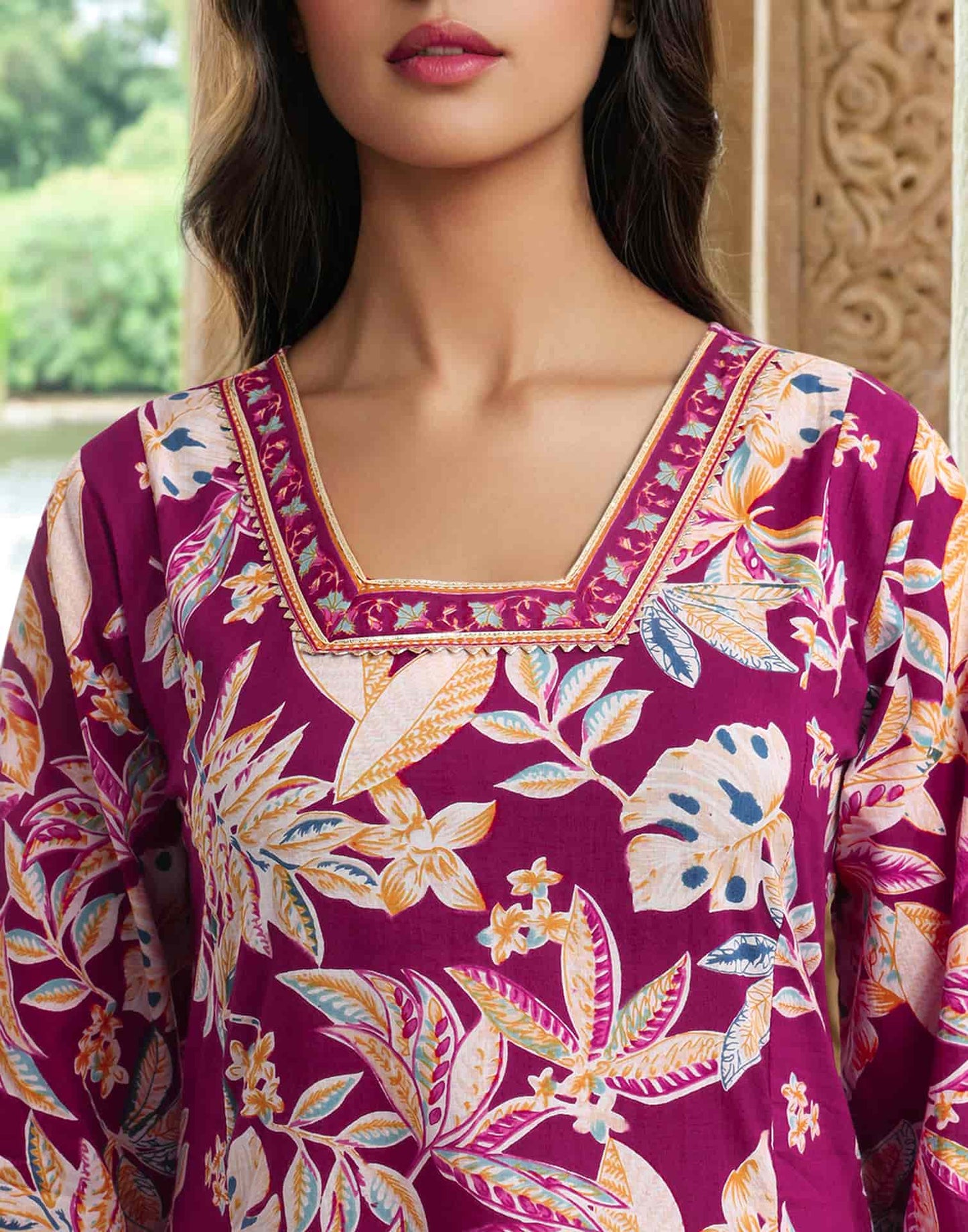 Experience the beauty of tradition with this Maroon Cotton kurta set. Adorned with Printed and styled with a Square Neck, the kurta exudes sophistication. Complemented with Palazzo and an elegant dupatta, this complete outfit is ideal for Casual Wear. Crafted in India with high-quality fabric, it ensures ease of movement and effortless elegance. Family Function Wear, Kurta with Pant & Dupatta, Comfortable Fit.