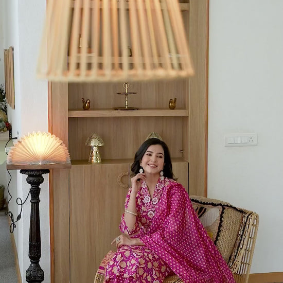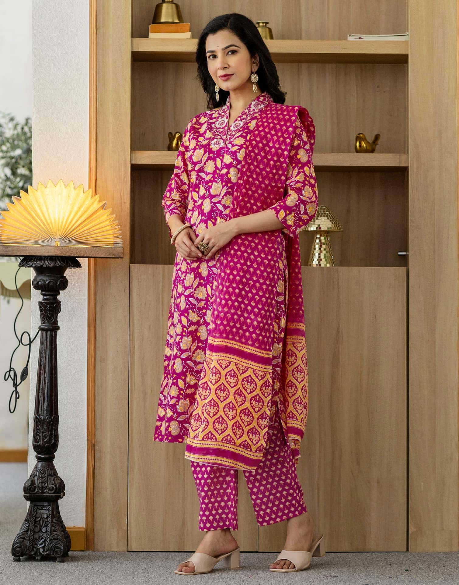 This Rani Pink Cotton kurta set is beautifully designed with Printed. The kurta features a V Neck and a graceful silhouette for an elegant appeal. It is paired with Pant and a matching dupatta, making it a complete kurta set. Perfect for Casual Wear, this ethnic wear for women offers high-quality fabric, ease of movement, and timeless charm. Comfortable Fit, Easy to Maintain, Traditional Occasion Outfit.
