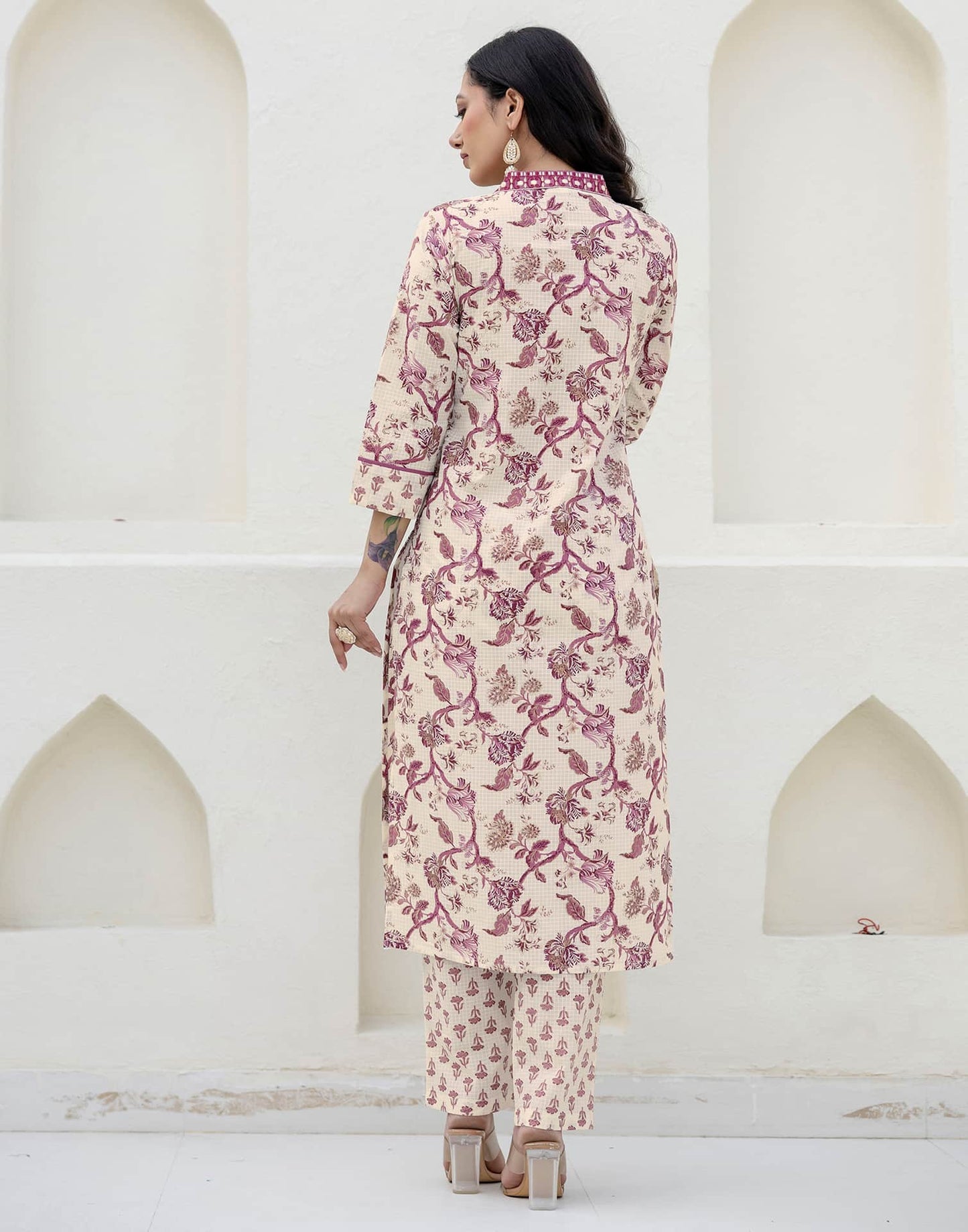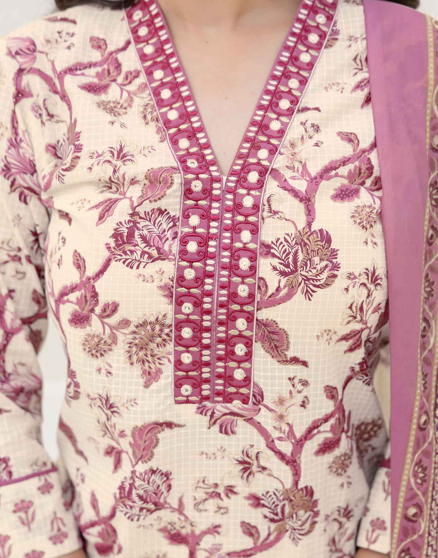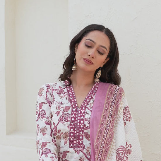 Refresh your ethnic collection with this Cotton kurta set in Off White. Highlighted by Printed and styled with a V-Neck, the kurta blends comfort with tradition. Teamed with Pant and dupatta, this outfit is perfect for Casual Wear. It guarantees all-day comfort, lightweight fabric, and the ease of an everyday ethnic wear. Matching Bottoms, Comfortable Fit, Indian Wear.