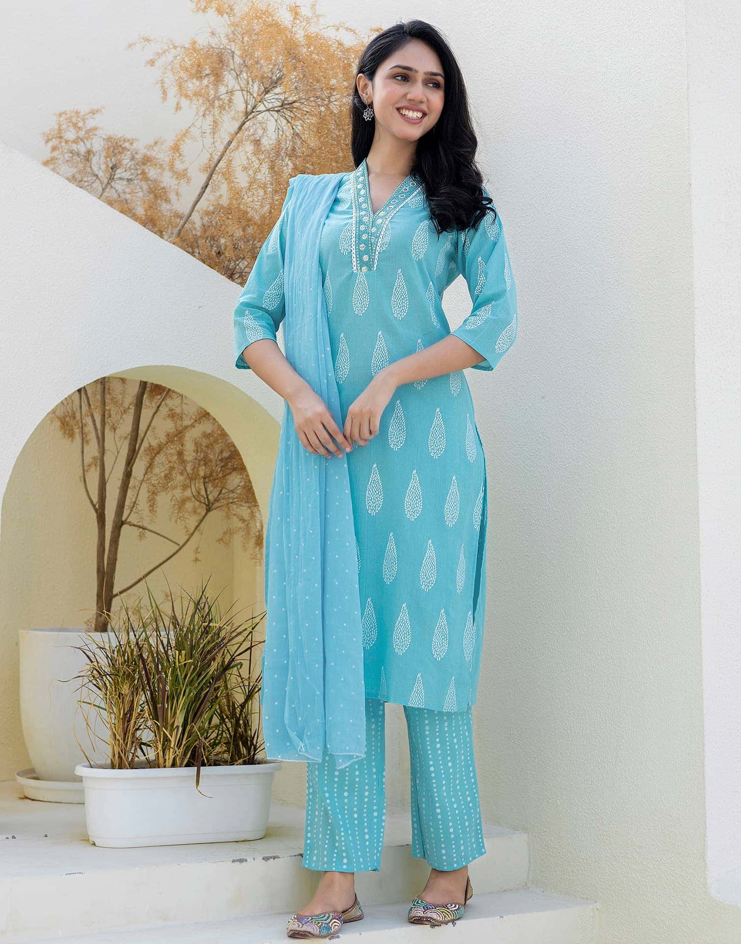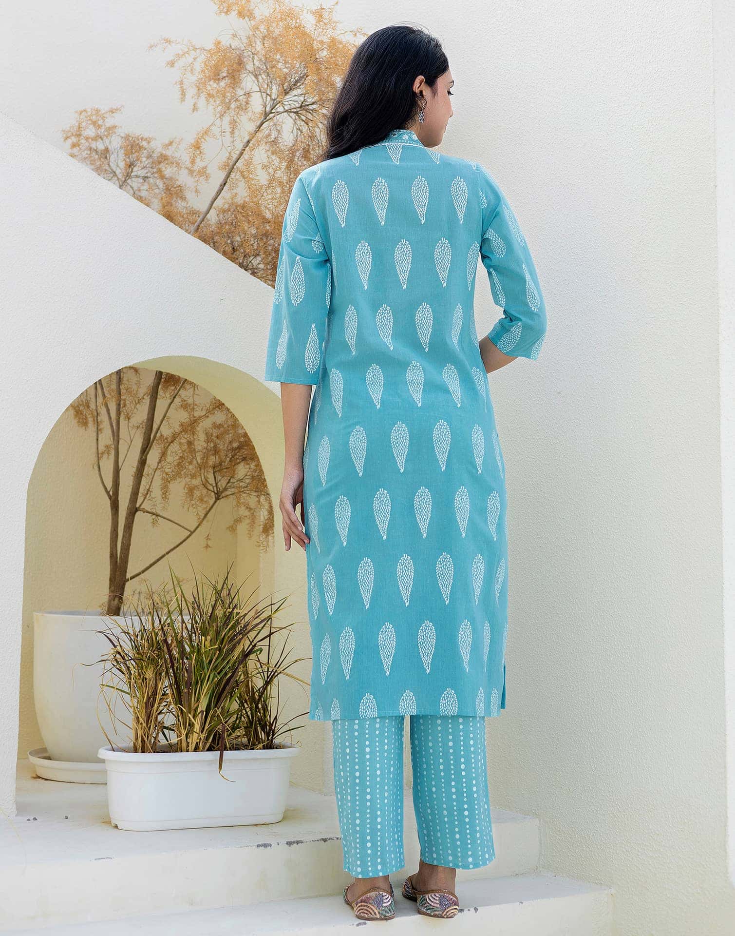 Refresh your ethnic collection with this Cotton kurta set in Sky Blue. Highlighted by Printed and styled with a Mandarin Collar, the kurta blends comfort with tradition. Teamed with Pant With Pocket and dupatta, this outfit is perfect for Casual Wear. It guarantees comfortable wear, soft & breathable fabric, and the ease of an everyday ethnic wear. Comfortable Wear, All-day Comfort, Matching Bottoms.