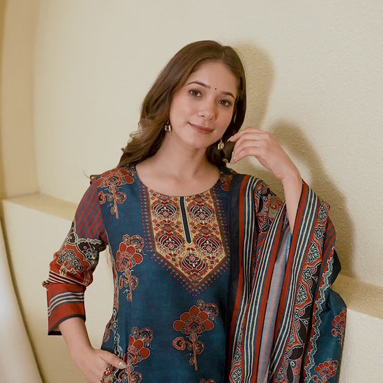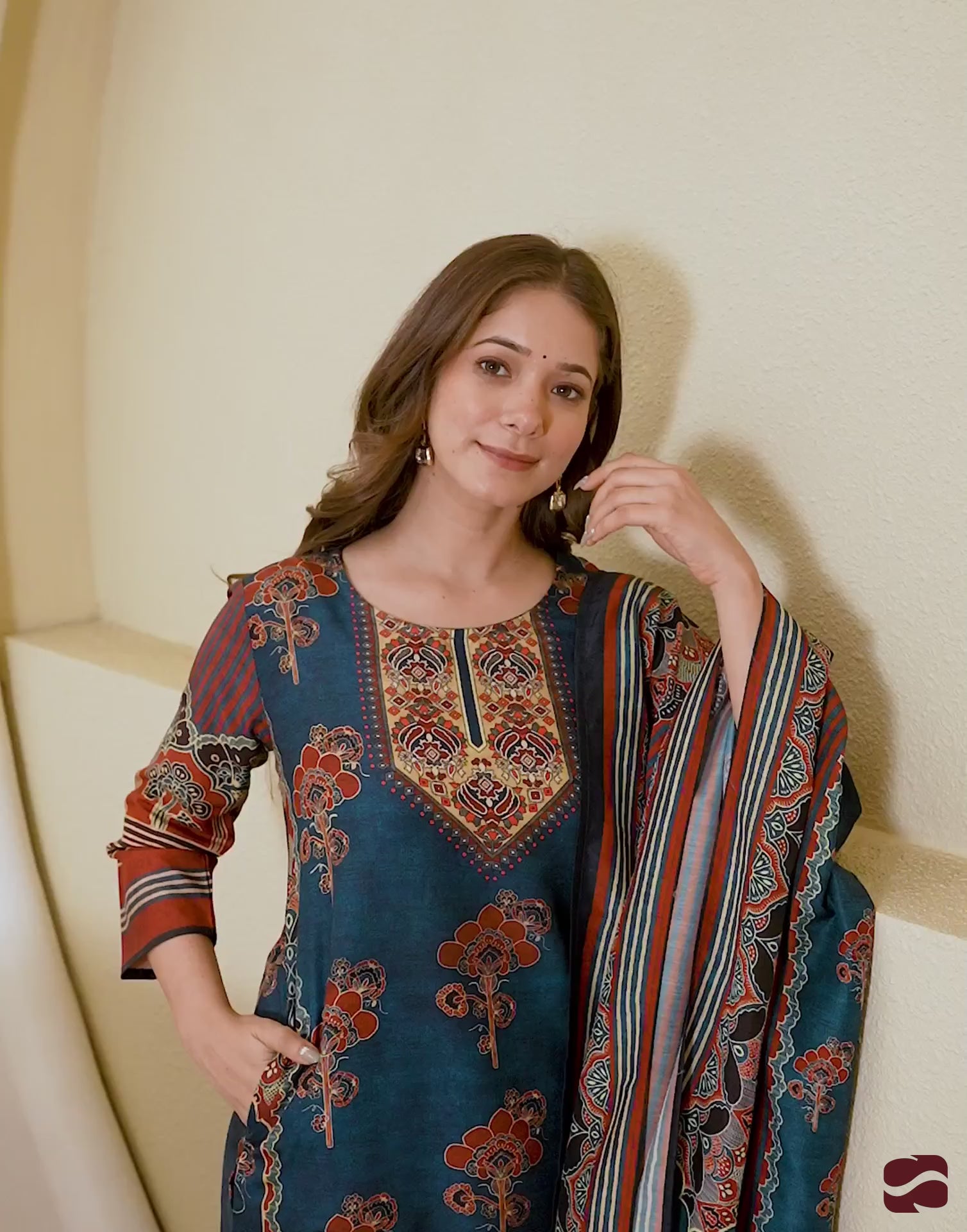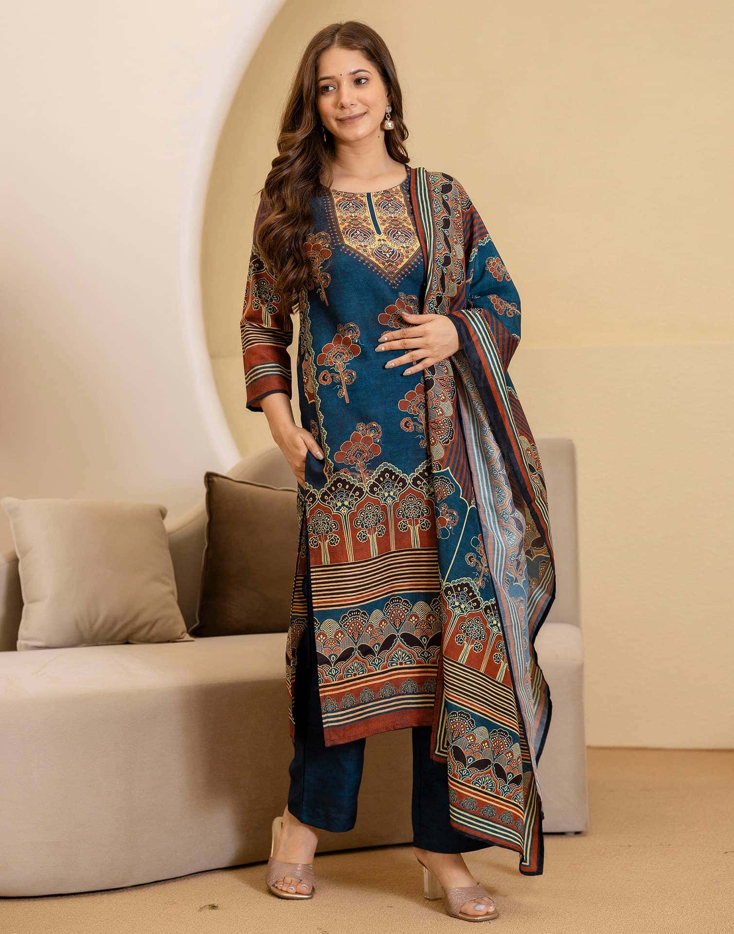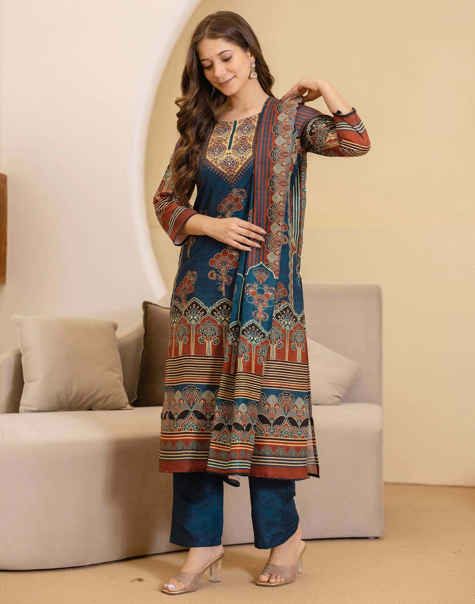 This Rama Blue Cotton Blend kurta set is beautifully designed with Printed. The kurta features a Round Neck and a graceful silhouette for an elegant appeal. It is paired with Pant With Pocket and a matching dupatta, making it a complete kurta set. Perfect for Everyday Wear, this ethnic wear for women offers high-quality fabric, all-day comfort, and timeless charm. Premium Fabric, Ethnic Wear for Women, Casual Wear.