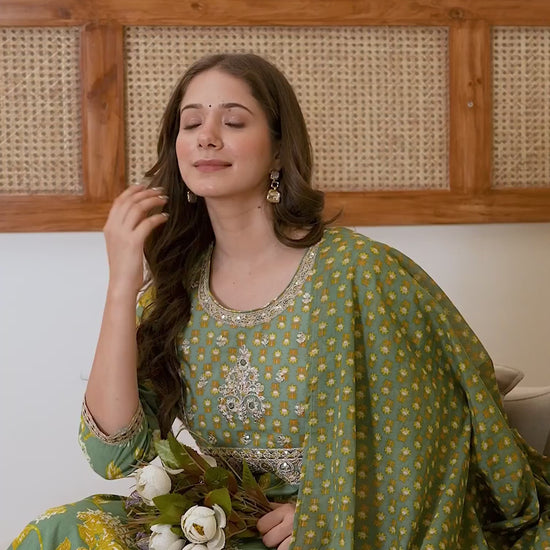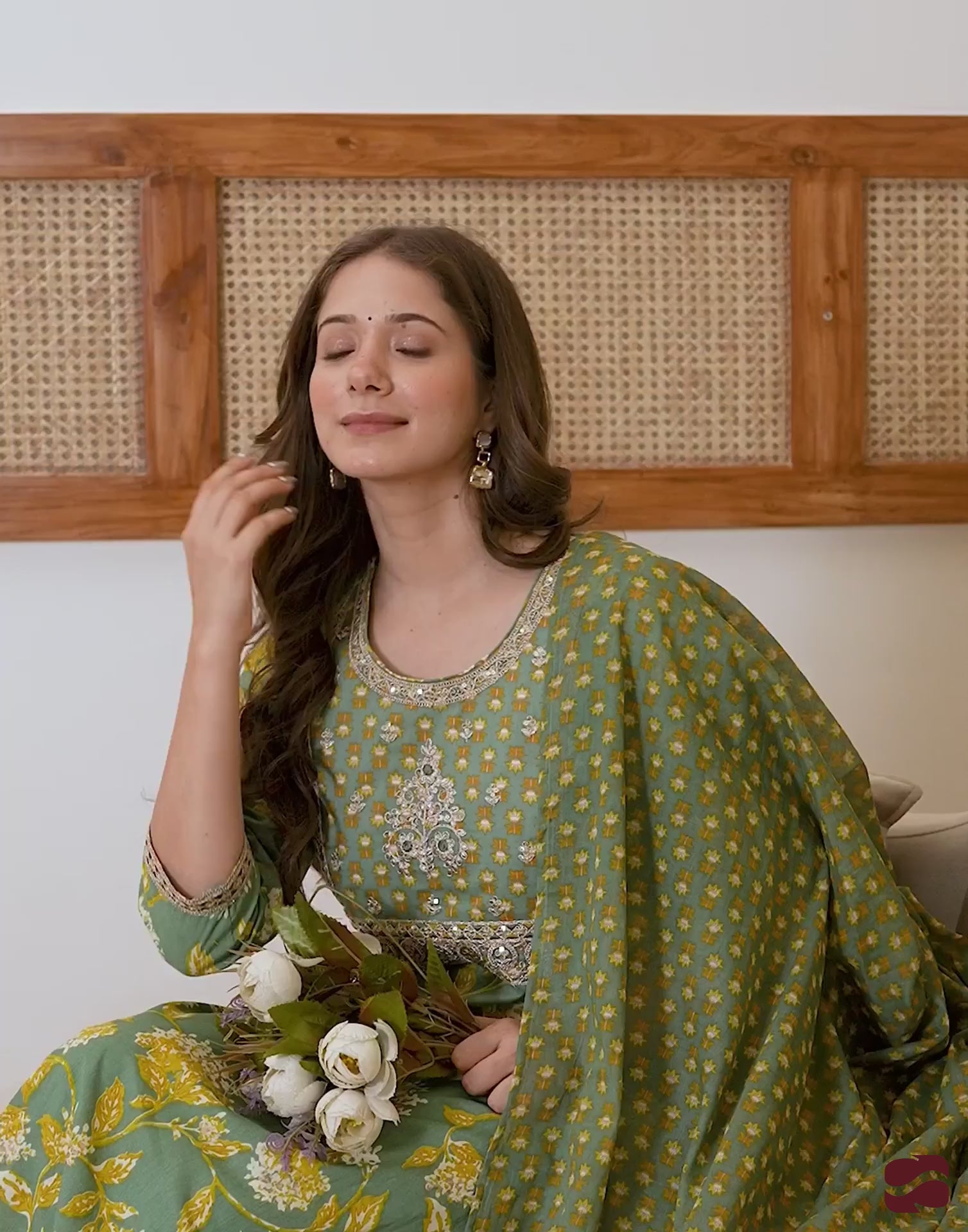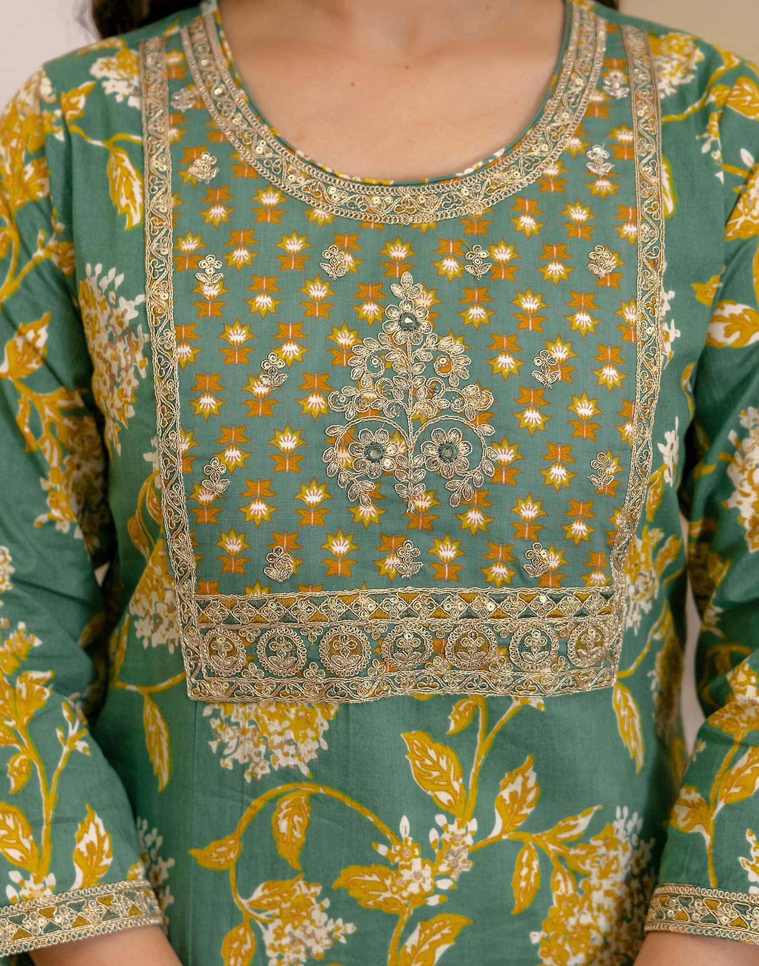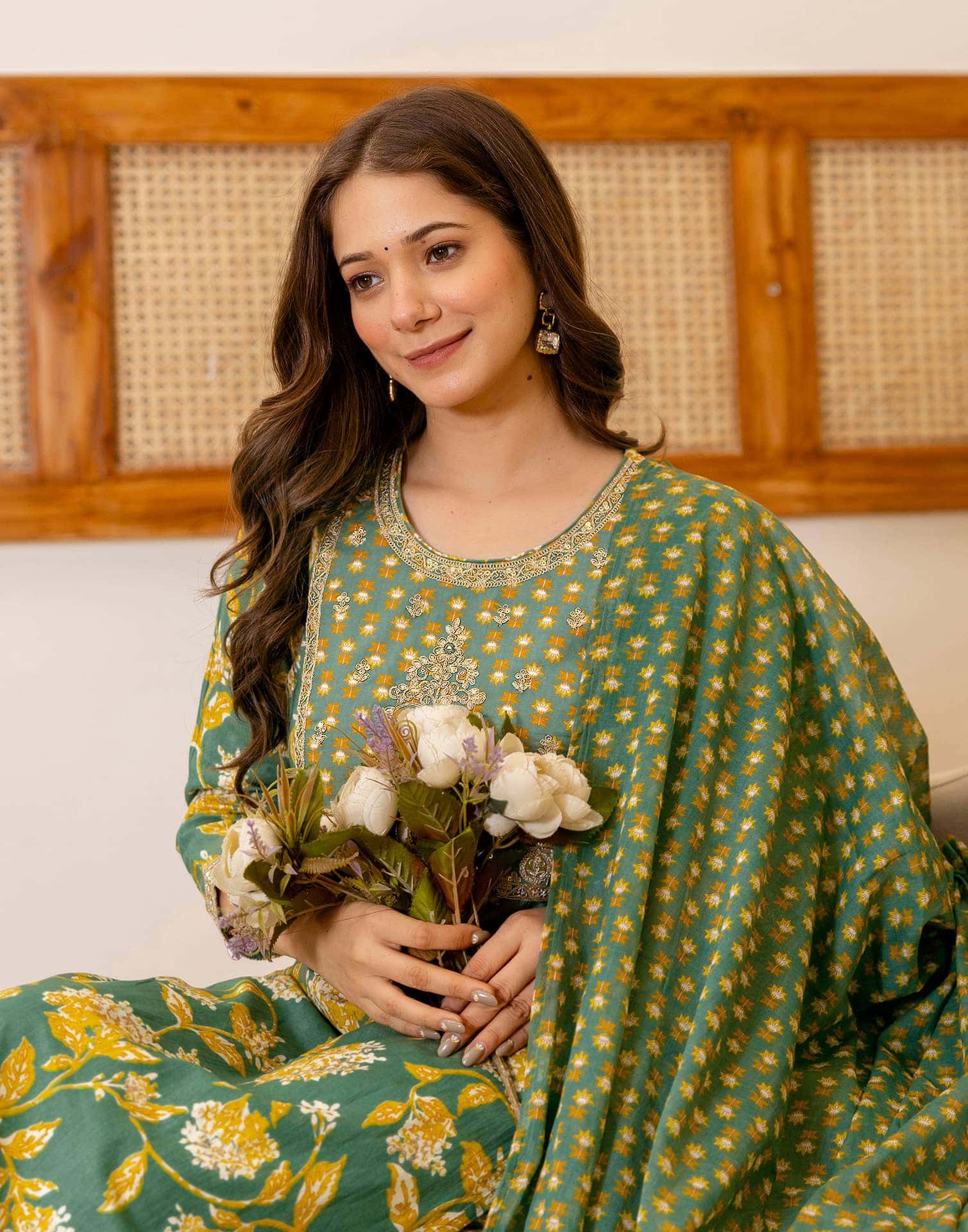 This Dull Green Cotton kurta set is beautifully designed with Printed. The kurta features a Round Neck and a graceful silhouette for an elegant appeal. It is paired with Pant With Pocket and a matching dupatta, making it a complete kurta set. Perfect for Casual Wear, this ethnic wear for women offers premium fabric, all-day comfort, and timeless charm. Traditional Outfit, Ethnic Wear for Women, Soft & Breathable Fabric.