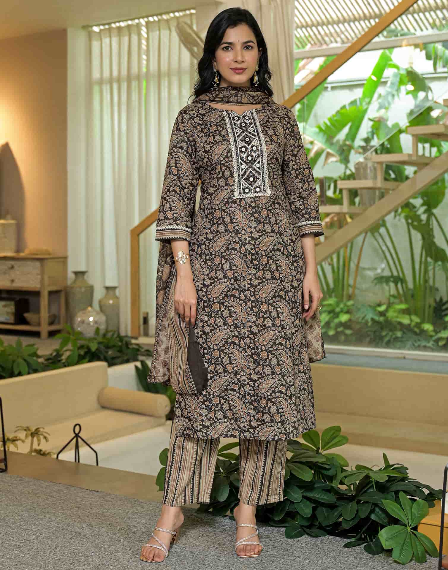 This Brown Cotton kurta set is beautifully designed with Printed. The kurta features a Round Neck and a graceful silhouette for an elegant appeal. It is paired with Pant and a matching dupatta, making it a complete kurta set. Perfect for Casual Wear, this ethnic wear for women offers lightweight fabric, ease of movement, and timeless charm. Breathable Kurta, Premium Fabric, Easy to Maintain.