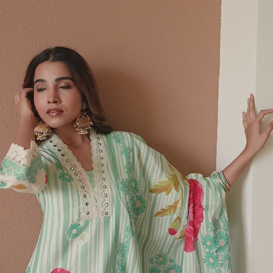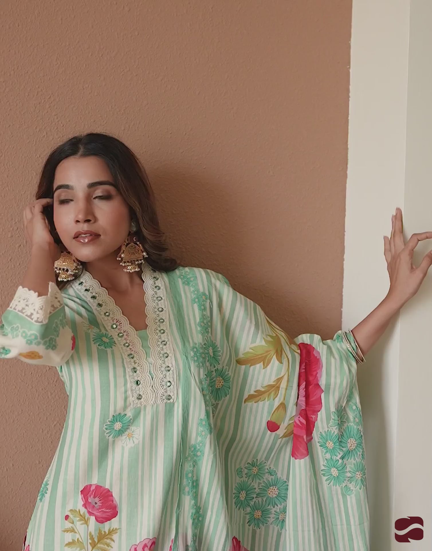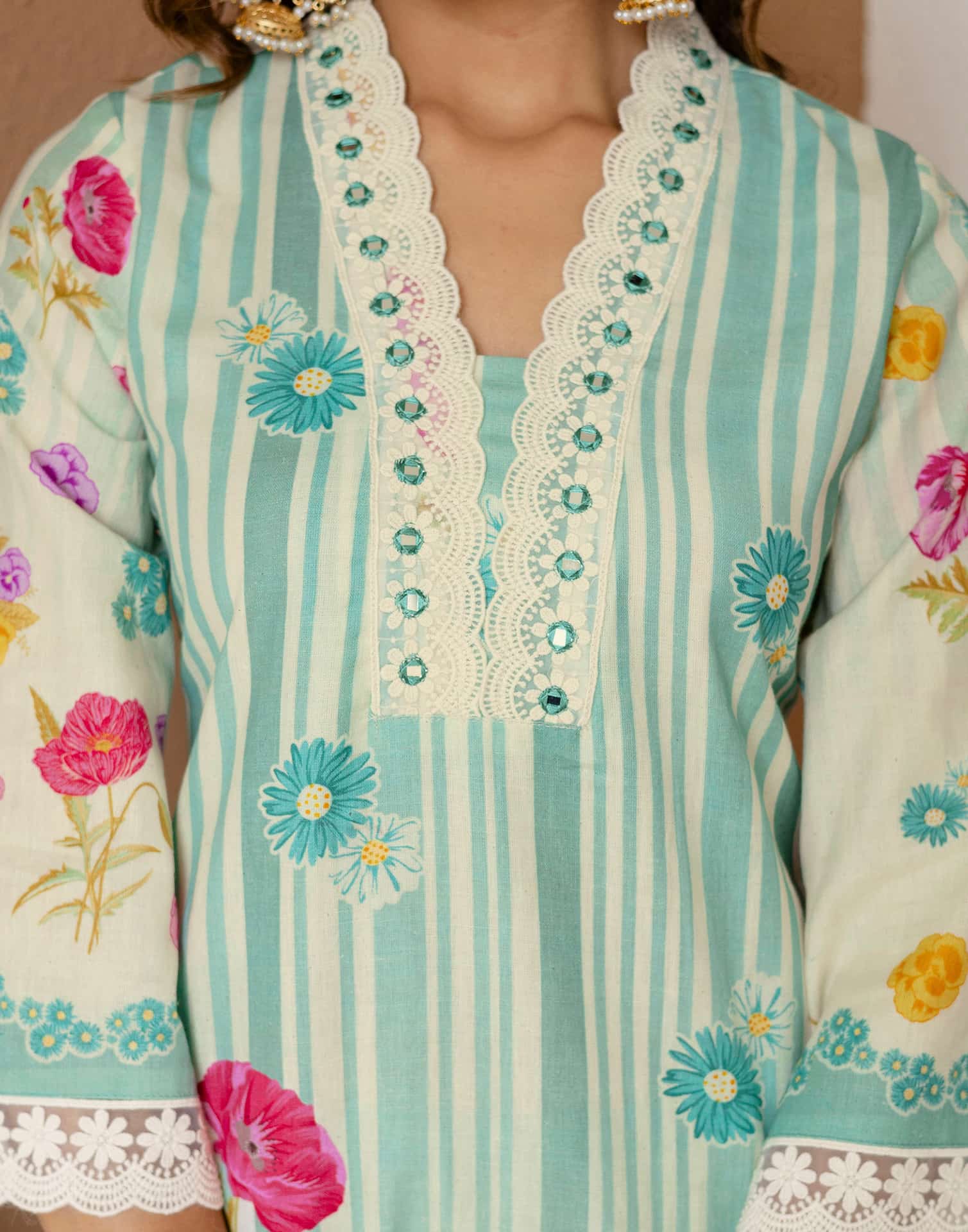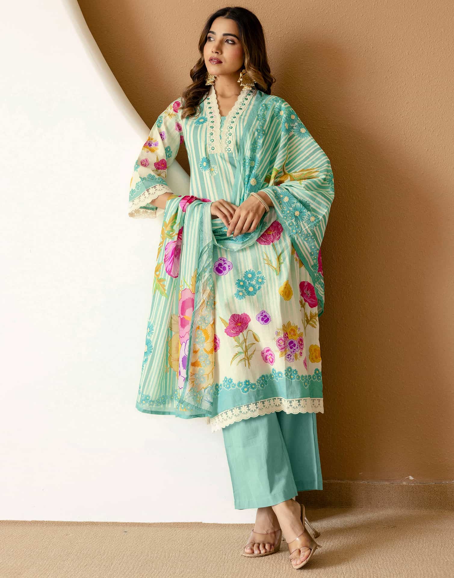 This Green Cotton kurta set with Floral Printed is crafted for women who love Indian wear with a modern twist. The kurta’s V-Neck and graceful cut enhance its style, while Palazzo and dupatta complete the ensemble. Designed for Casual Wear, it promises premium fabric, all-day comfort, and lasting appeal. Traditional Outfit, Traditional Occasion Outfit, Festive Wear.