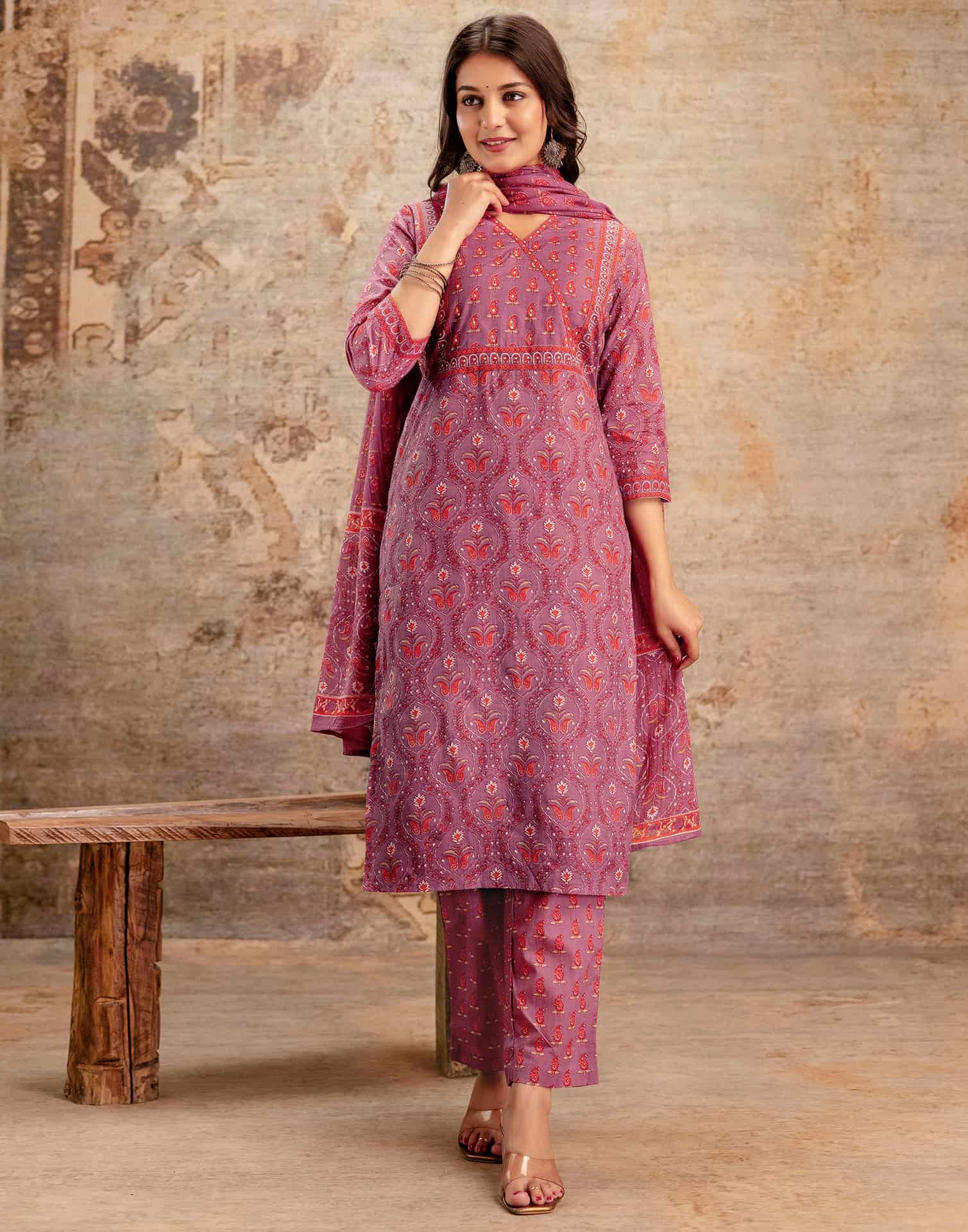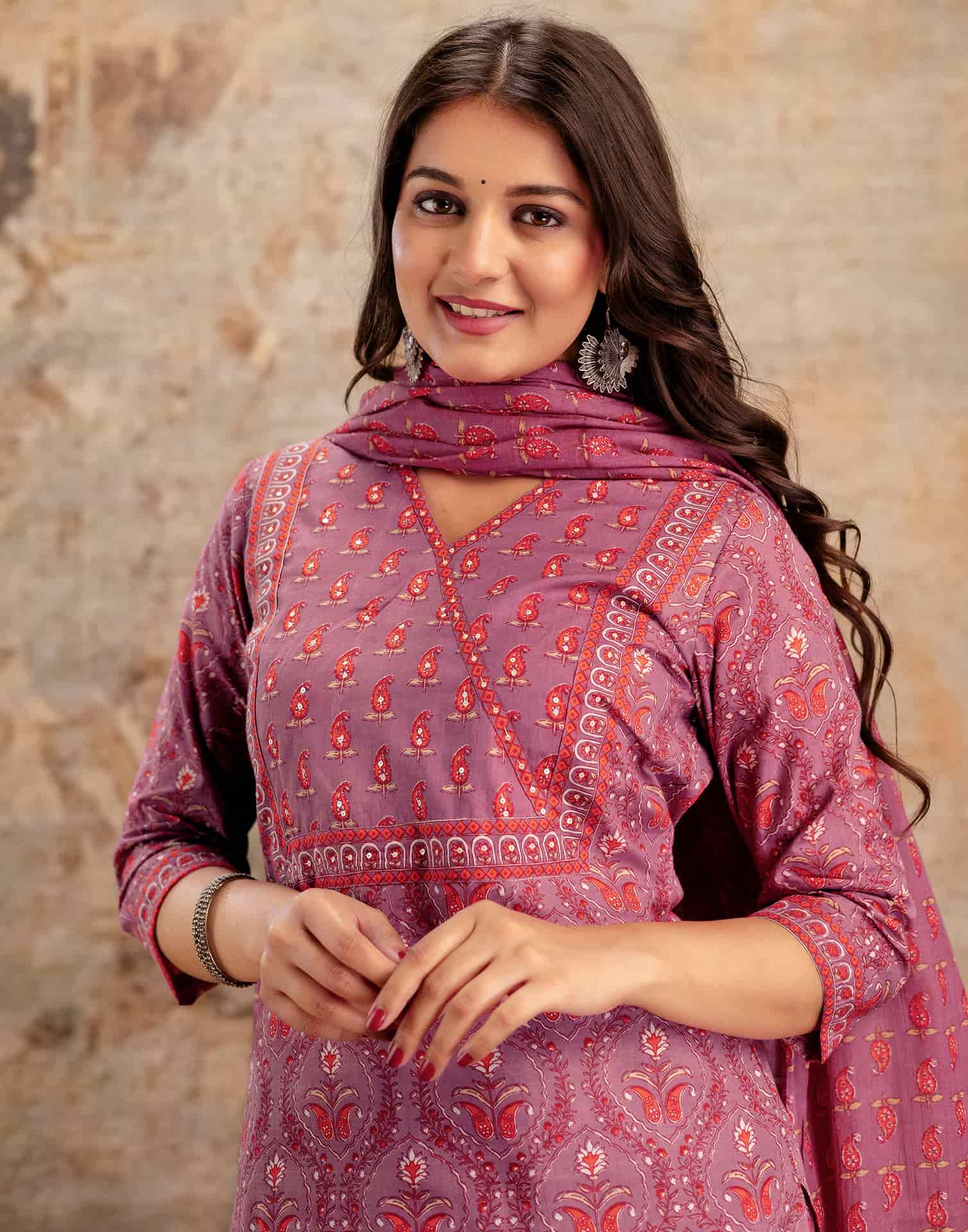 This Purple Cotton kurta set is beautifully designed with Floral Printed. The kurta features a V-Neck and a graceful silhouette for an elegant appeal. It is paired with Pant and a matching dupatta, making it a complete kurta set. Perfect for Casual Wear, this ethnic wear for women offers high-quality fabric, comfortable wear, and timeless charm. Lightweight Fabric, Easy to Maintain, Complete Kurta Set.