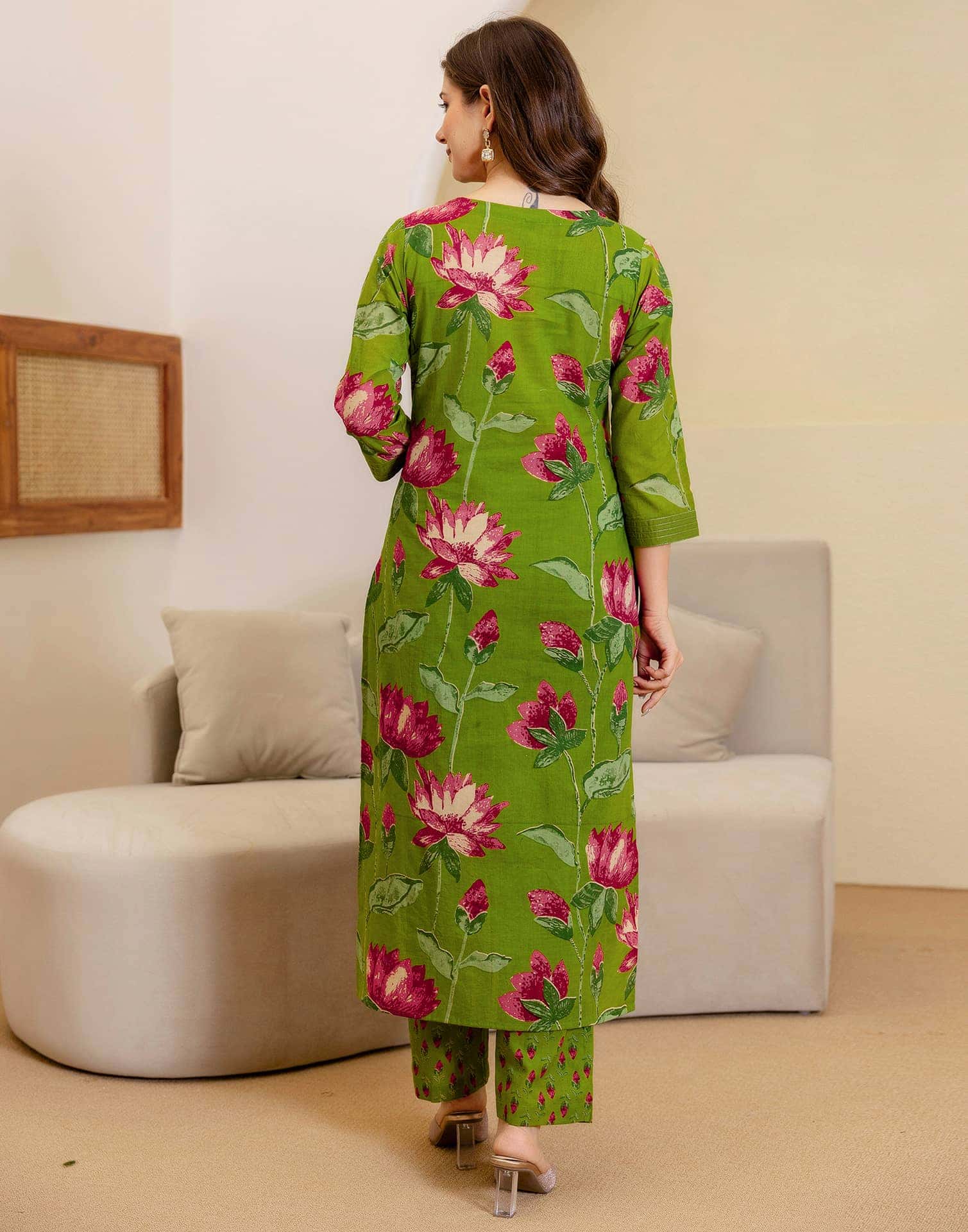 Bring elegance to every occasion with this Green Cotton kurta set. Featuring Floral Printed on the kurta and a V Neck, it radiates traditional charm. Styled with Pant With Pocket and dupatta, this outfit is ideal for Casual Wear. Its lightweight fabric ensures breathability and ease of movement, while the dupatta adds a touch of grace. Comfortable Wear, Everyday Wear, Easy to Maintain.
