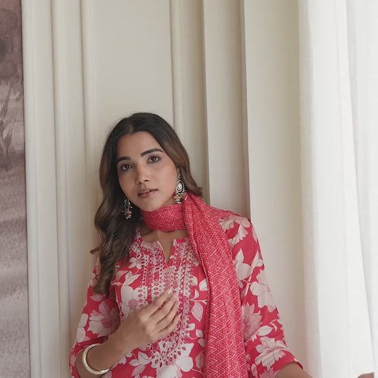 Bring elegance to every occasion with this Pink Cotton kurta set. Featuring Floral Printed on the kurta and a V-Neck, it radiates traditional charm. Styled with Pant and dupatta, this outfit is ideal for Casual Wear. Its lightweight fabric ensures breathability and comfortable wear, while the dupatta adds a touch of grace. Comfortable Fit, Graceful Silhouette, Semi-formal Wear.