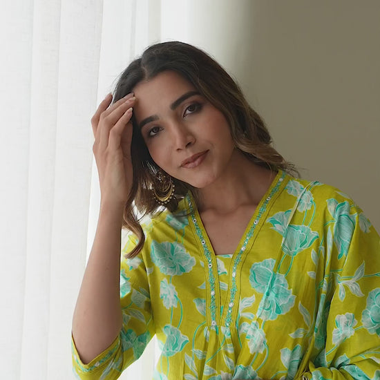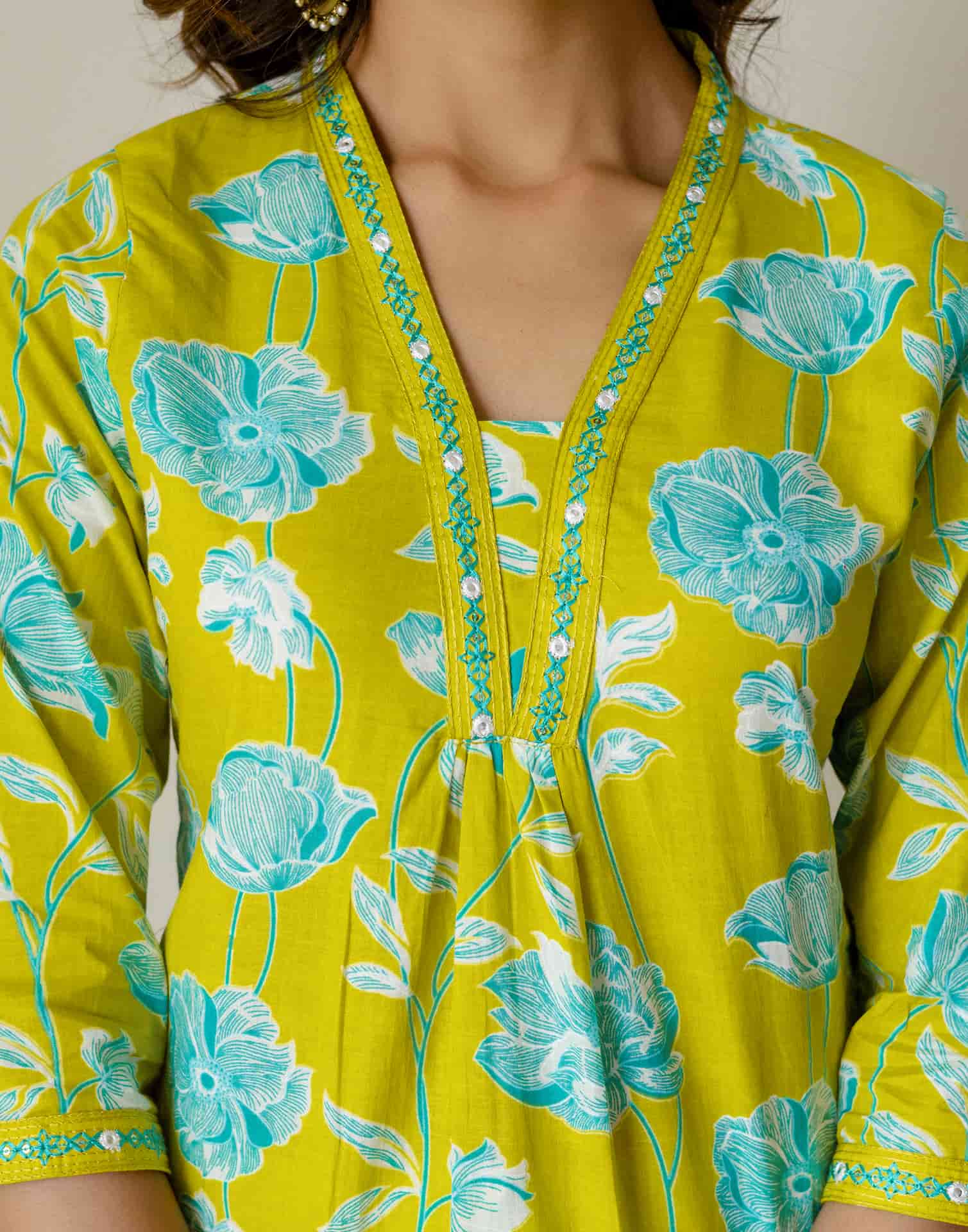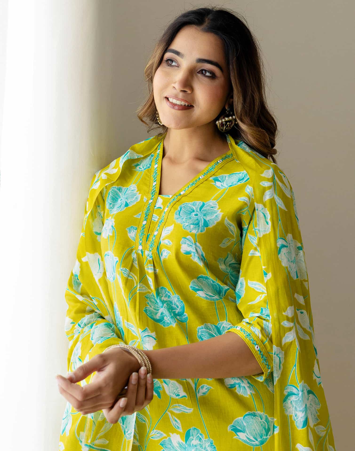 Elevate your ethnic wardrobe with this Cotton kurta set in Green. Designed with Printed and a V-Neck, the kurta offers a comfortable fit and stylish finish. The set includes Pant and a dupatta, completing the look. Suitable for Casual Wear, it combines lightweight fabric, comfortable wear, and modern design. Soft & Breathable Fabric, Lightweight Fabric, Family Function Wear.
