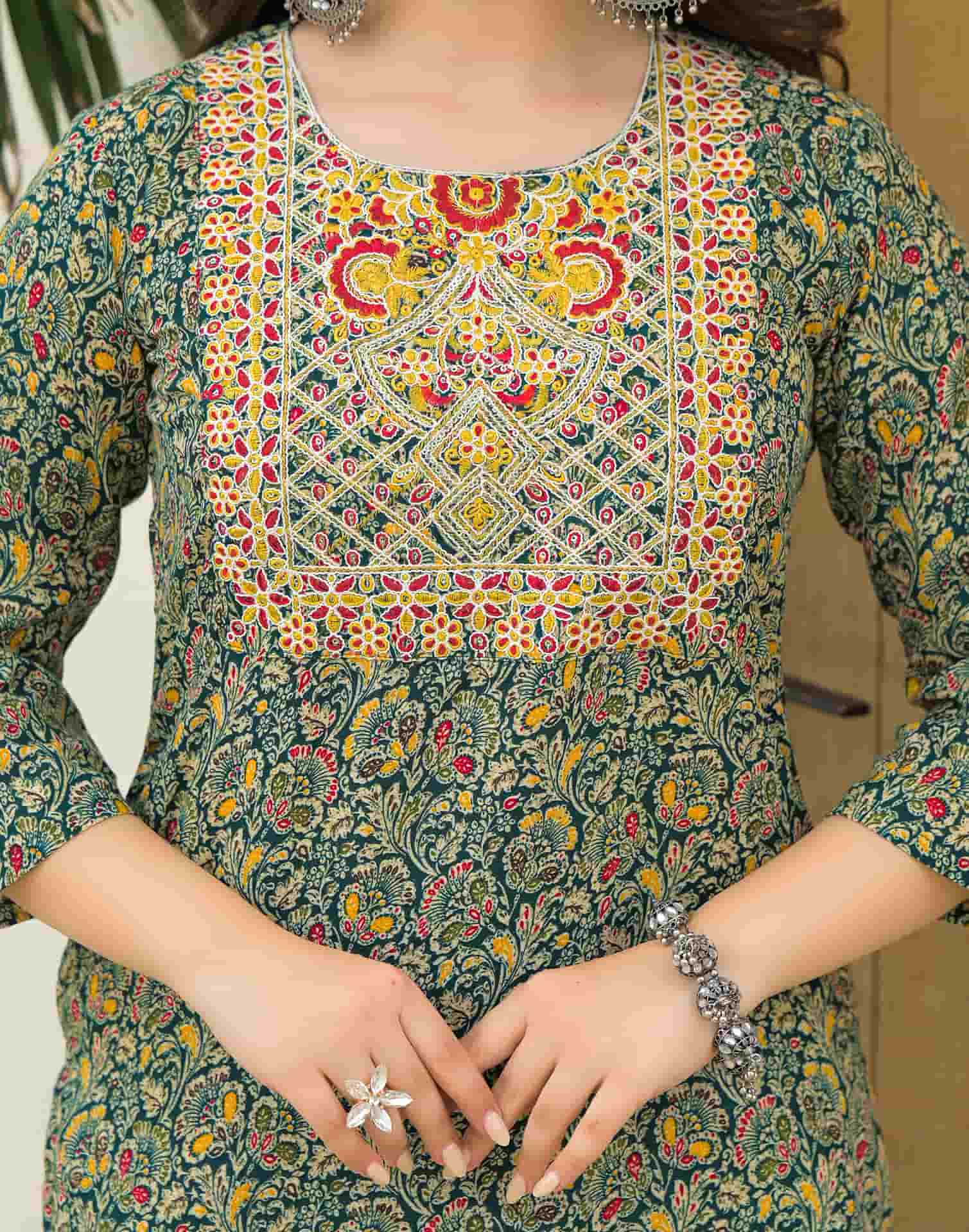 Refresh your ethnic collection with this Cotton kurta set in Dark Green. Highlighted by Printed and styled with a Round Neck, the kurta blends comfort with tradition. Teamed with Pant and dupatta, this outfit is perfect for Casual Wear. It guarantees ease of movement, lightweight fabric, and the ease of an everyday ethnic wear. Graceful Silhouette, Soft & Breathable Fabric, Ease of Movement.