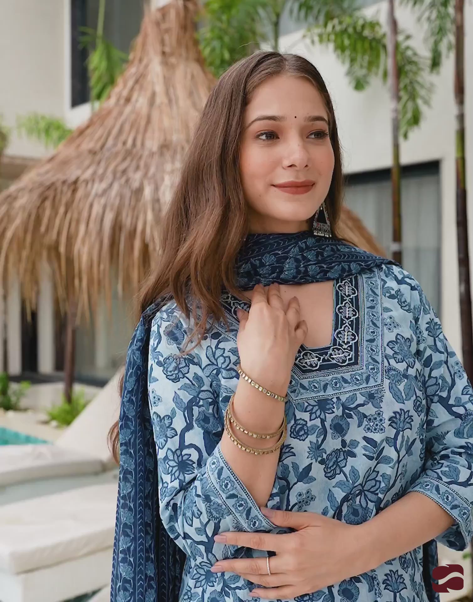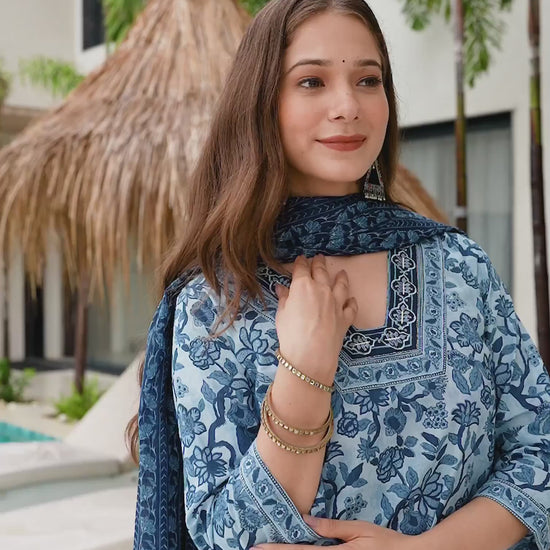 Bring elegance to every occasion with this Sky Blue Cotton kurta set. Featuring Floral Printed on the kurta and a Square Neck, it radiates traditional charm. Styled with Pant With Pocket and dupatta, this outfit is ideal for Casual Wear. Its high-quality fabric ensures breathability and comfortable wear, while the dupatta adds a touch of grace. Complete Kurta Set, Everyday Wear, Elegant Dupatta.