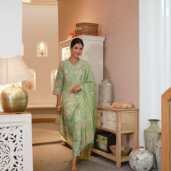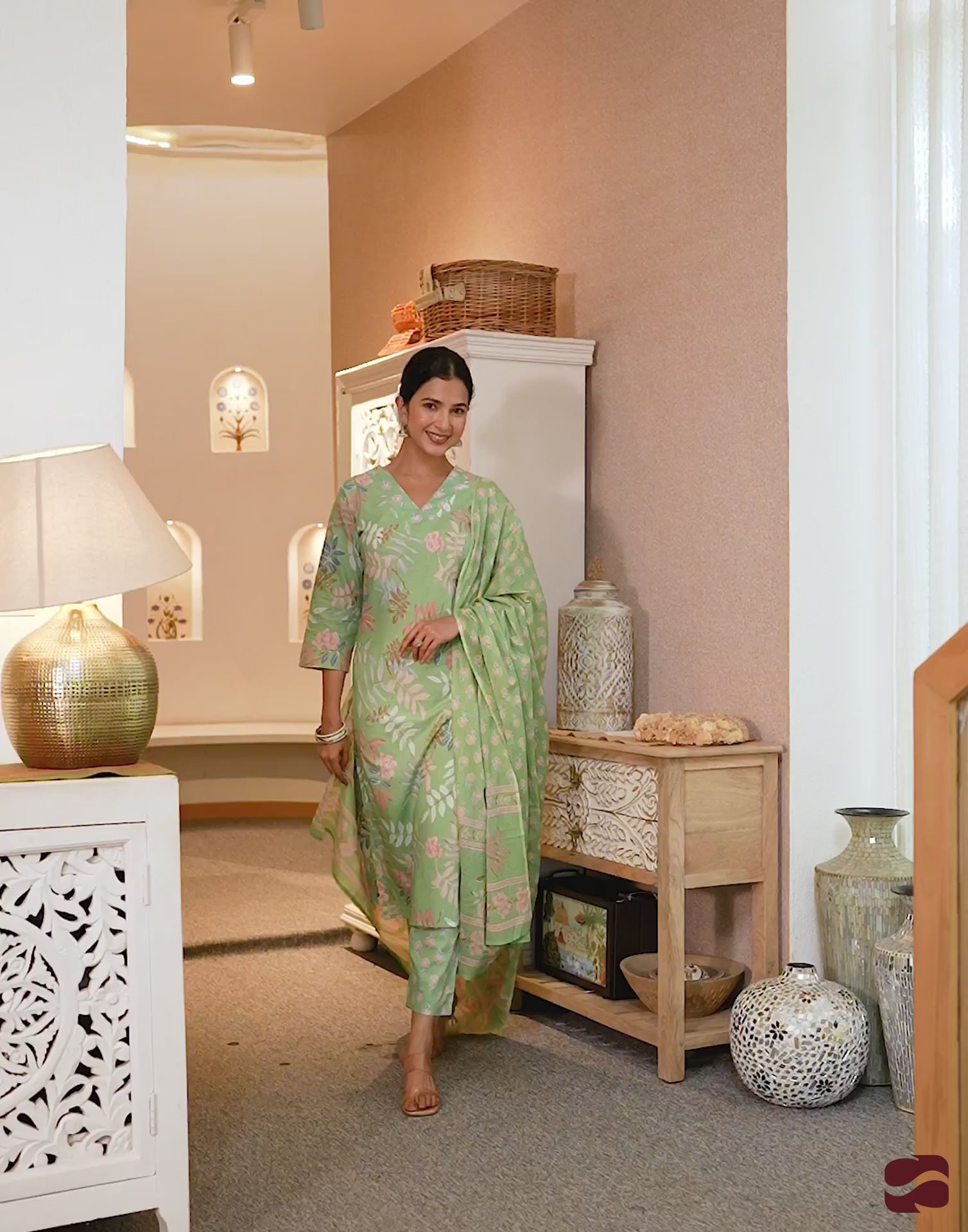 Step into sophistication with this Light Green Cotton kurta set adorned with Printed. The kurta features a V-Neck for a refined look, paired with Pant and dupatta. Perfect for Casual Wear, it delivers all-day comfort, soft & breathable fabric, and effortless style. Festive Wear, Premium Fabric, All-day Comfort.