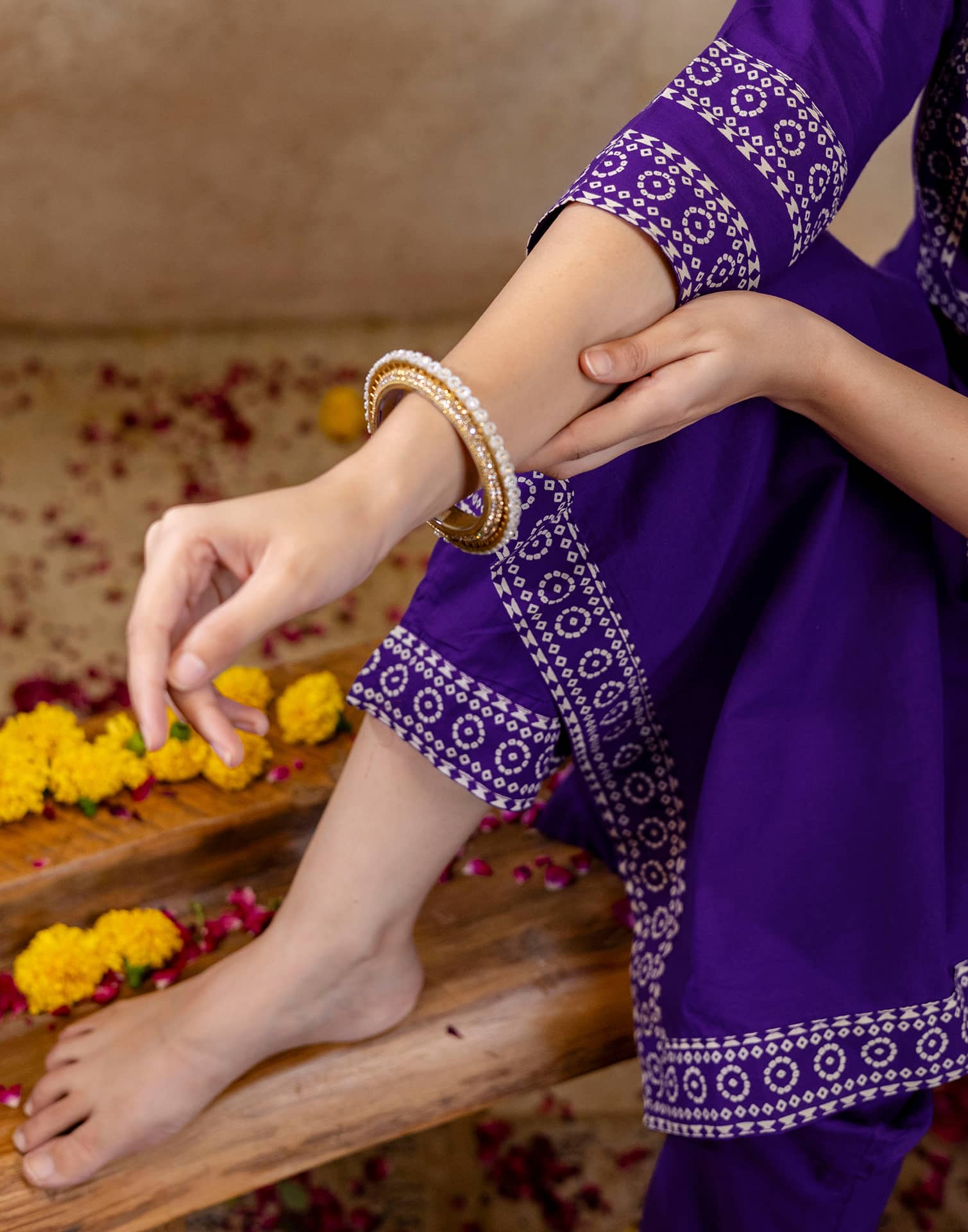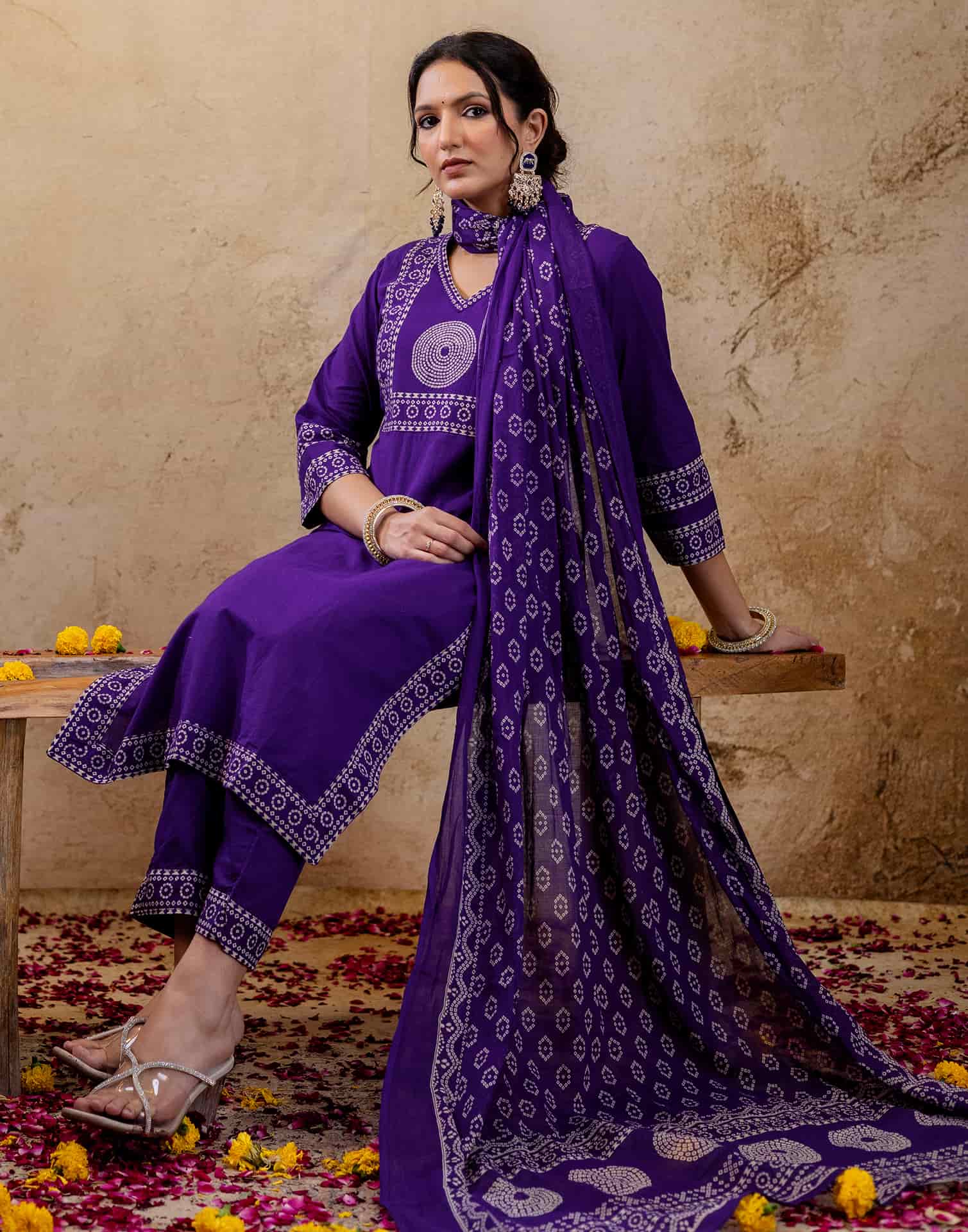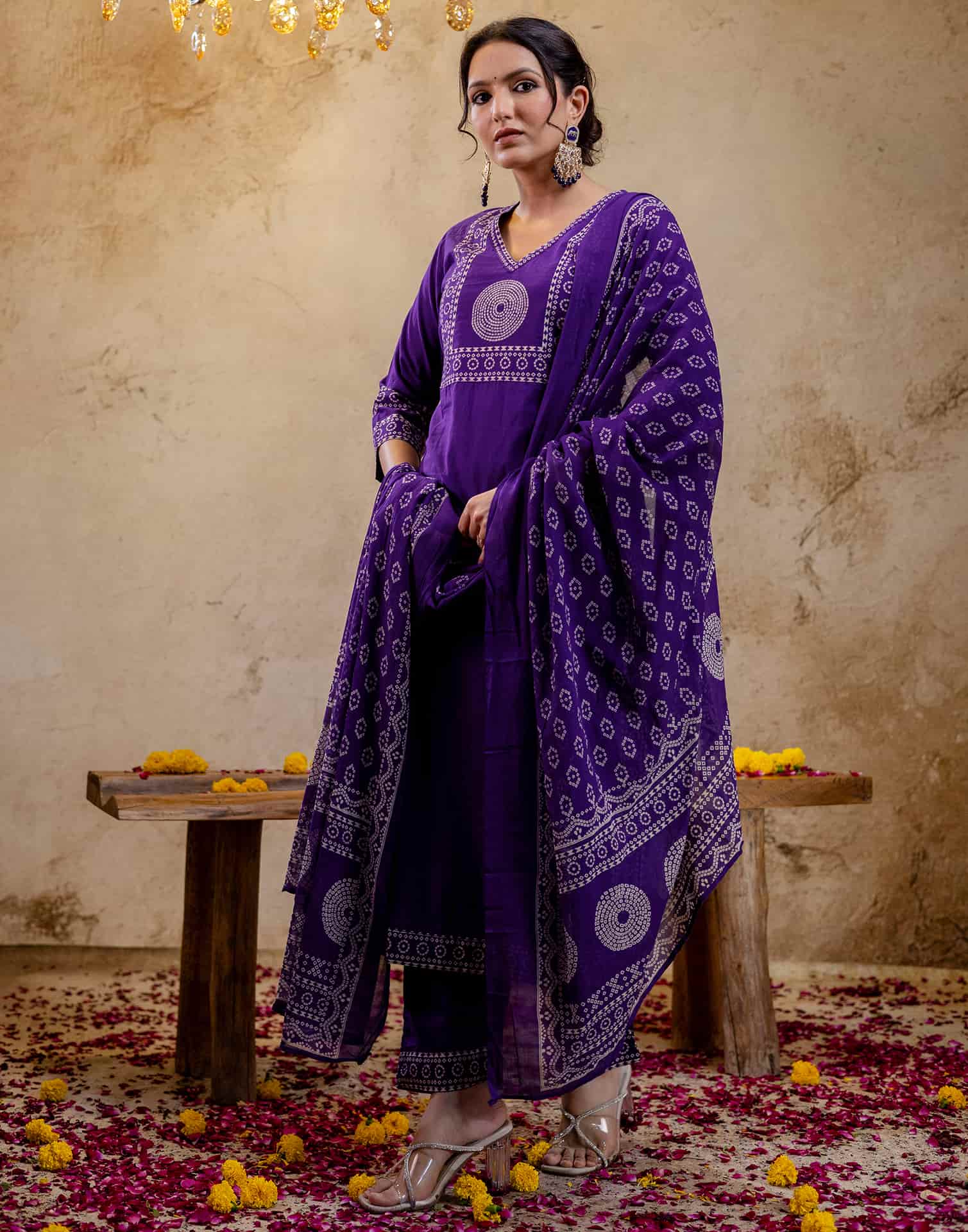 Step into sophistication with this Purple Cotton kurta set adorned with Bandhani Printed. The kurta features a V-Neck for a refined look, paired with Pant and dupatta. Perfect for Casual Wear, it delivers ease of movement, high-quality fabric, and effortless style. Ethnic Wear for Women, Comfortable Fit, Graceful Silhouette.