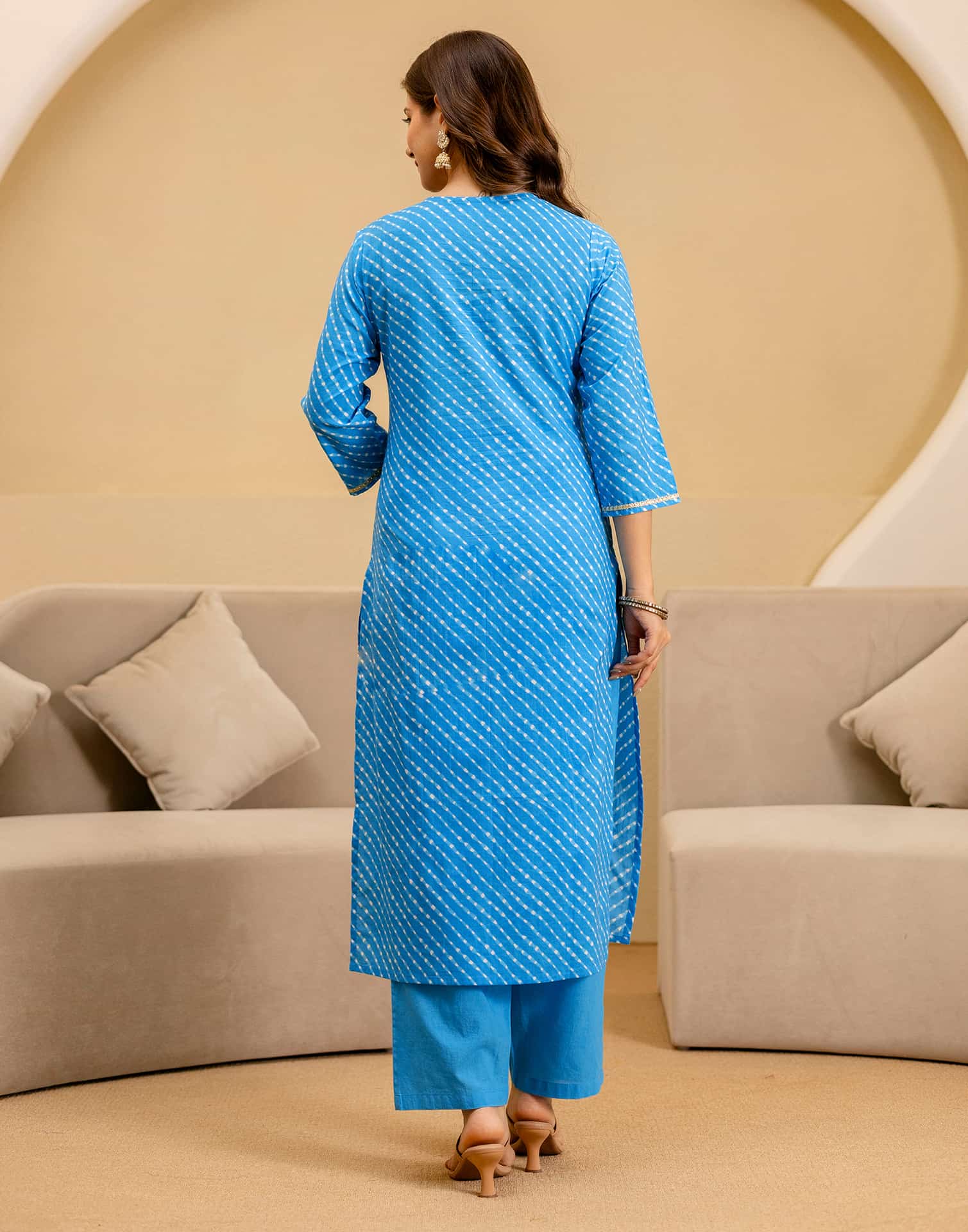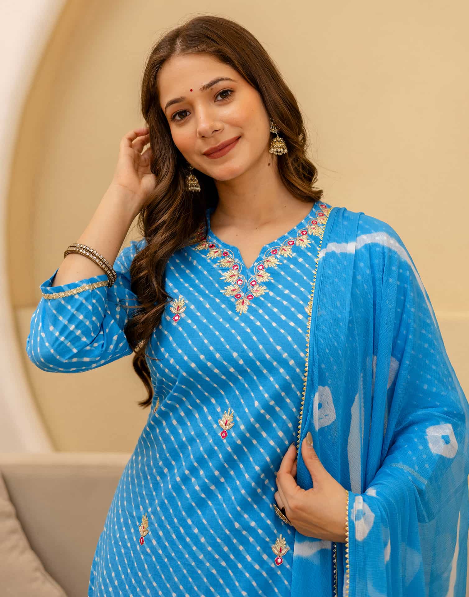 Step into sophistication with this Blue Cotton kurta set adorned with Bandhani Printed. The kurta features a V Neck for a refined look, paired with Pant With Pocket and dupatta. Perfect for Casual Wear, it delivers all-day comfort, high-quality fabric, and effortless style. Traditional Occasion Outfit, High-quality Fabric, Ethnic Wear for Women.