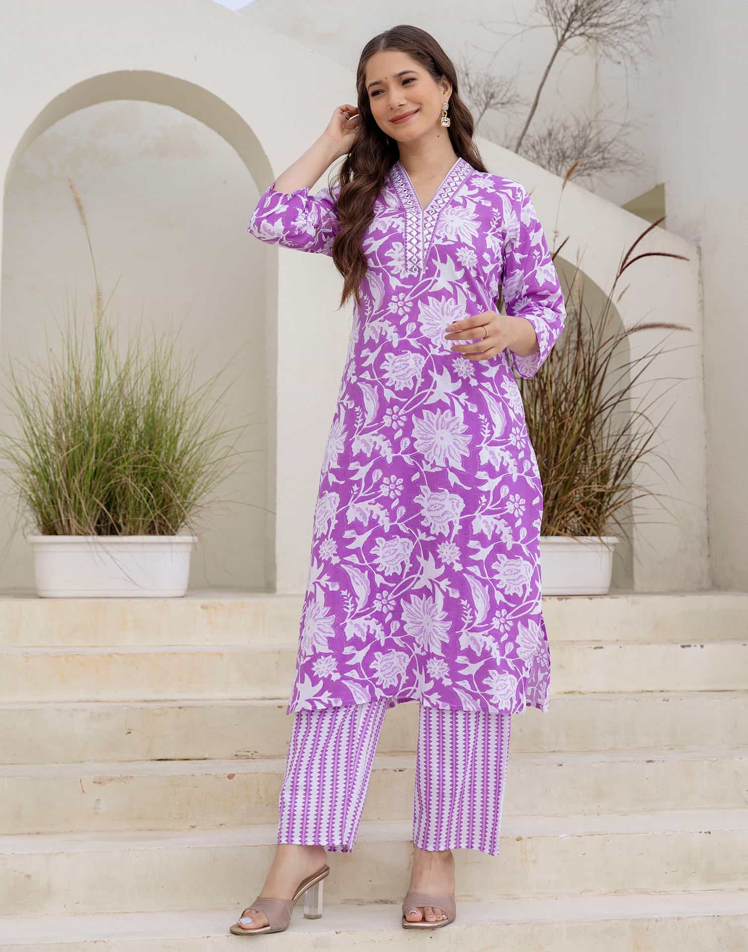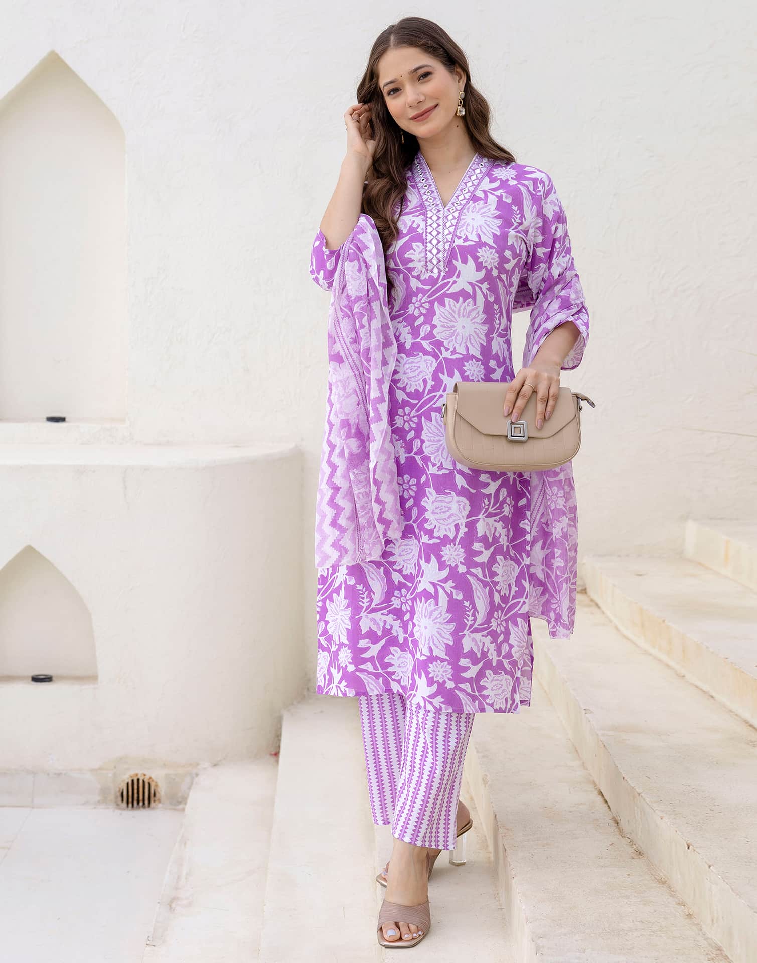 Bring elegance to every occasion with this Purple Cotton kurta set. Featuring Floral Printed on the kurta and a V Neck, it radiates traditional charm. Styled with Pant and dupatta, this outfit is ideal for Casual Wear. Its soft & breathable fabric ensures breathability and ease of movement, while the dupatta adds a touch of grace. Ethnic Wear for Women, Traditional Outfit, Family Function Wear.