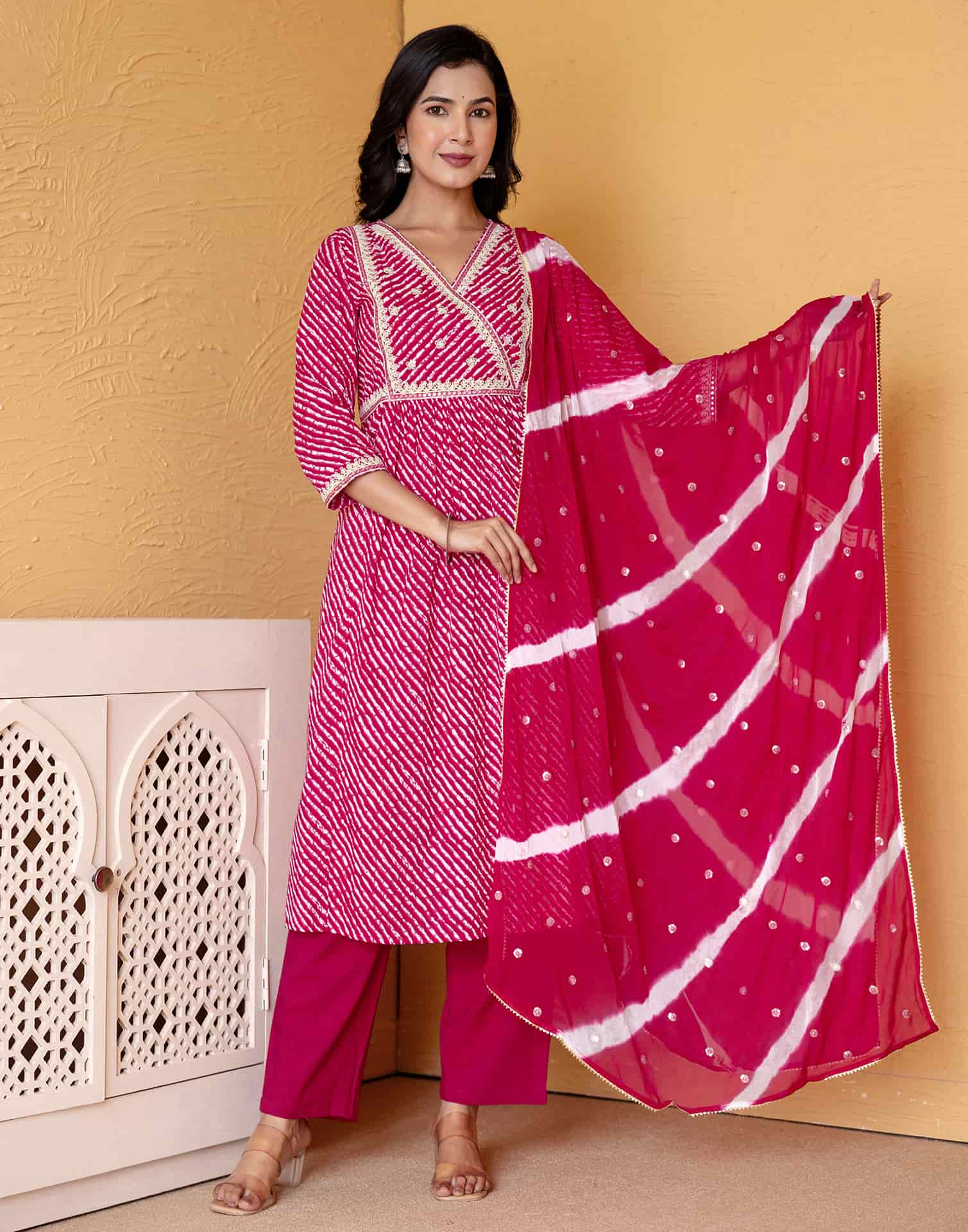 Experience the beauty of tradition with this Dark Pink Cotton kurta set. Adorned with Printed and styled with a V Neck, the kurta exudes sophistication. Complemented with Pant and an elegant dupatta, this complete outfit is ideal for Casual Wear. Crafted in India with high-quality fabric, it ensures all-day comfort and effortless elegance. High-quality Fabric, Indian Wear, Family Function Wear.
