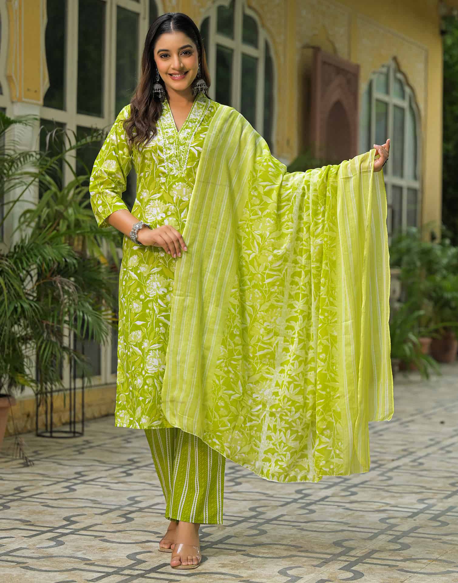 Experience the beauty of tradition with this Perrot Green Cotton kurta set. Adorned with Floral Printed and styled with a V Neck, the kurta exudes sophistication. Complemented with Pant and an elegant dupatta, this complete outfit is ideal for Casual Wear. Crafted in India with lightweight fabric, it ensures ease of movement and effortless elegance. Complete Kurta Set, Matching Bottoms, Family Function Wear.