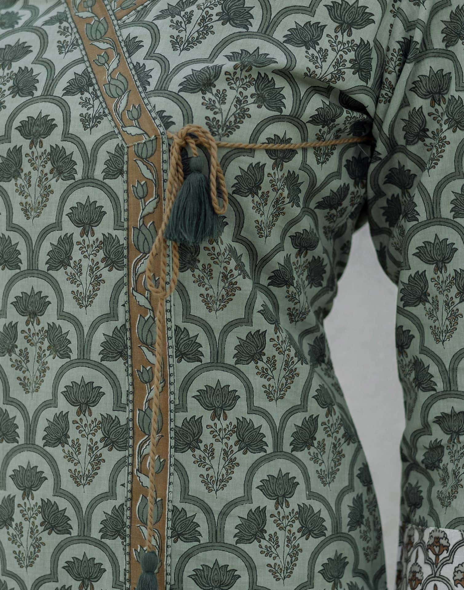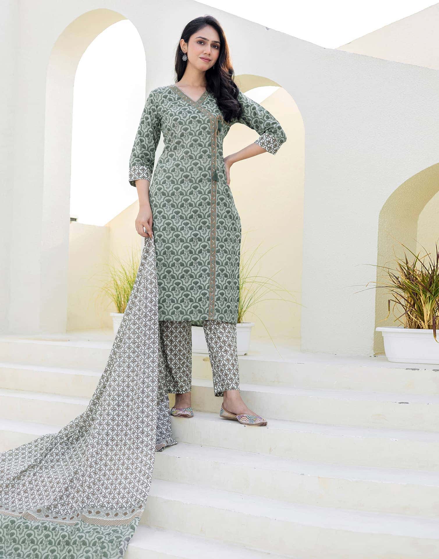 Experience the beauty of tradition with this Sage Green Cotton kurta set. Adorned with Printed and styled with a V Neck, the kurta exudes sophistication. Complemented with Pant With Pocket and an elegant dupatta, this complete outfit is ideal for Casual Wear. Crafted in India with soft & breathable fabric, it ensures comfortable wear and effortless elegance. Festive Wear, Graceful Silhouette, Everyday Wear.