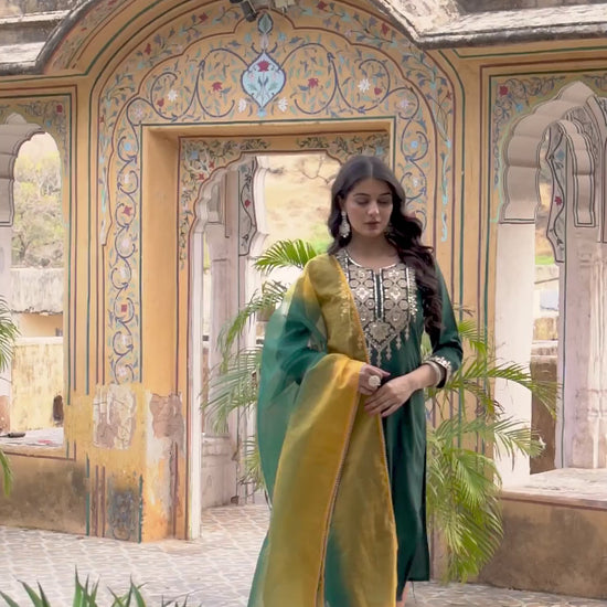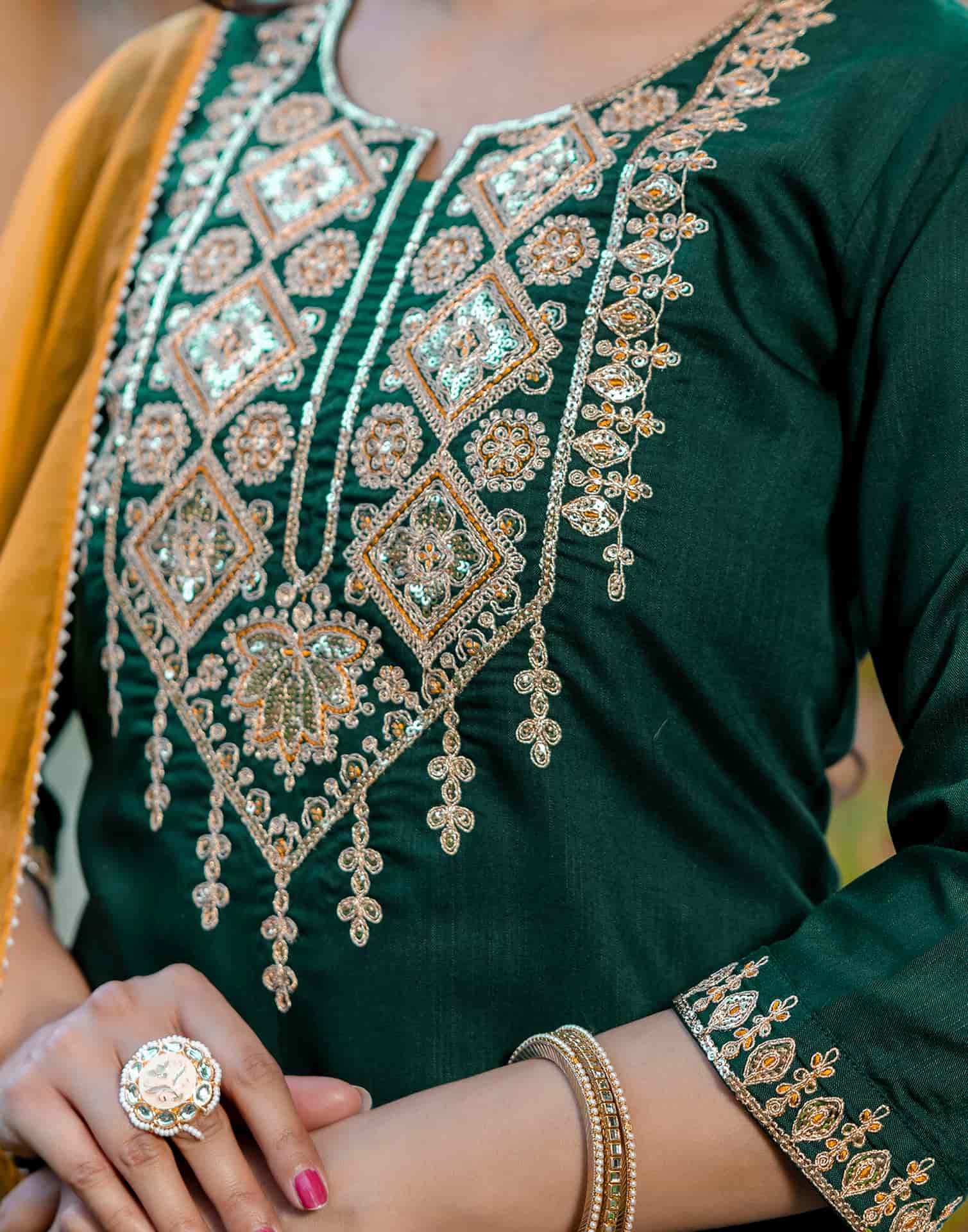 Crafted in Cotton with exquisite Sequin And Embroidery, this Dark Green kurta set is an essential for your ethnic wardrobe. The kurta comes with a Round Neck, paired with Pant and dupatta for a complete look. Ideal for Festive Wear, it ensures ease of movement and lightweight fabric. A perfect choice for festive wear and traditional outfit lovers. Comfortable Fit, Family Function Wear, Traditional Occasion Outfit.