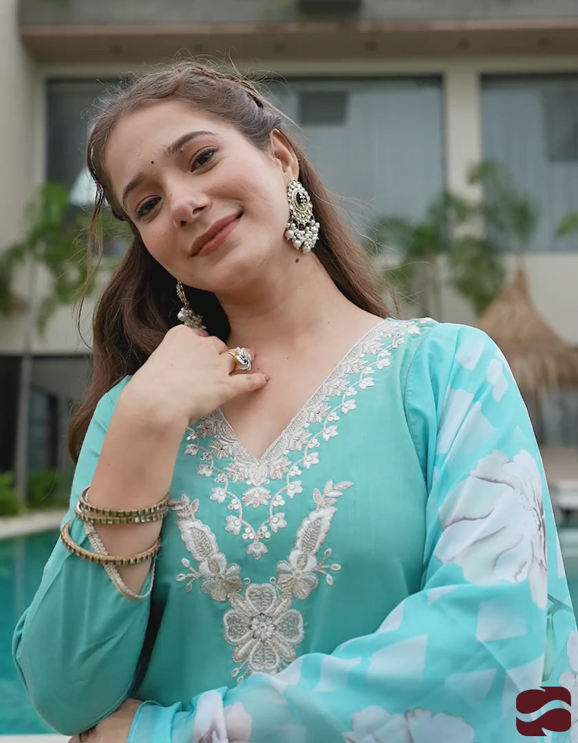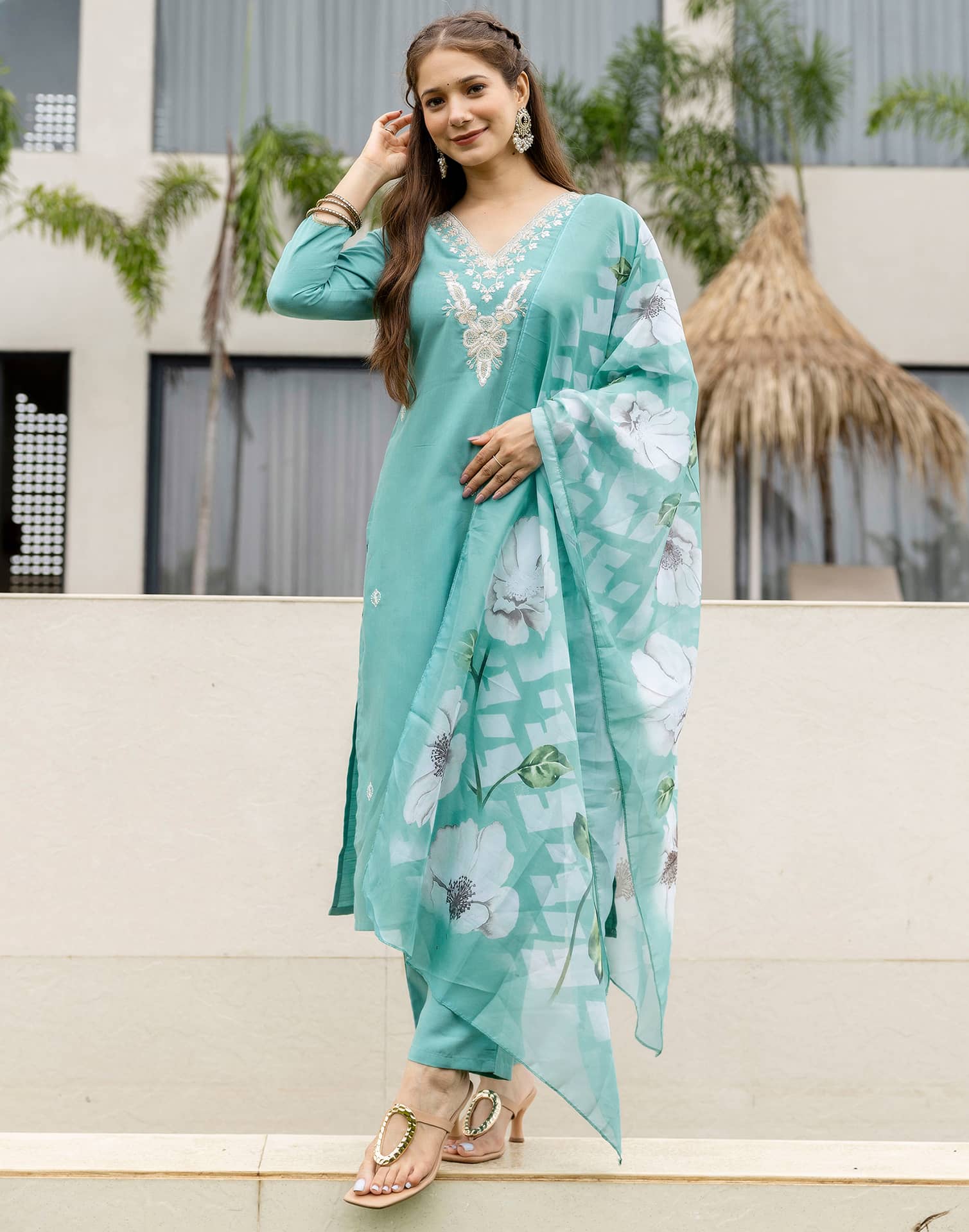 Cotton Slub Straight Embroidery V-Neck Kurta with Pant & Dupatta