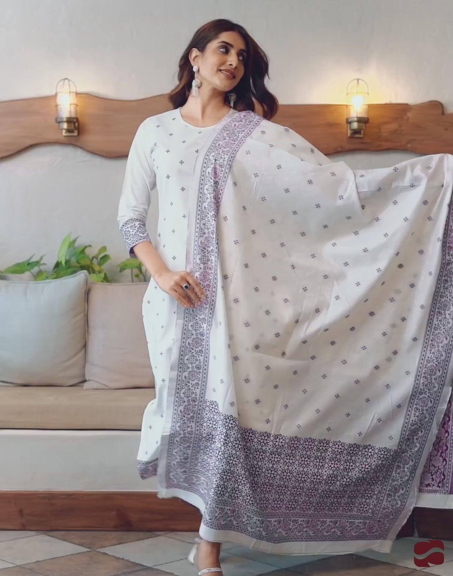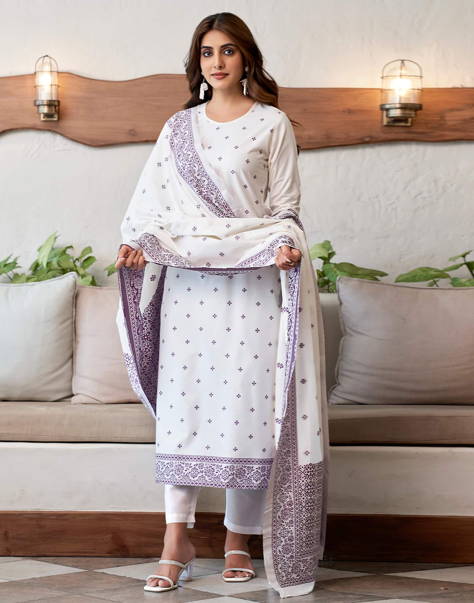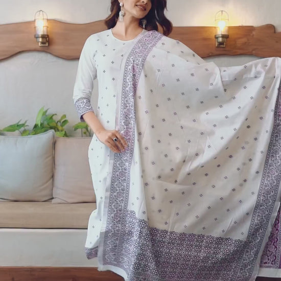 Elevate your ethnic wardrobe with this Cotton kurta set in Off White. Designed with Solid and a Round Neck, the kurta offers a comfortable fit and stylish finish. The set includes Pant and a dupatta, completing the look. Suitable for Festive Wear, it combines premium fabric, comfortable wear, and modern design. Lightweight Fabric, Everyday Wear, Soft & Breathable Fabric.