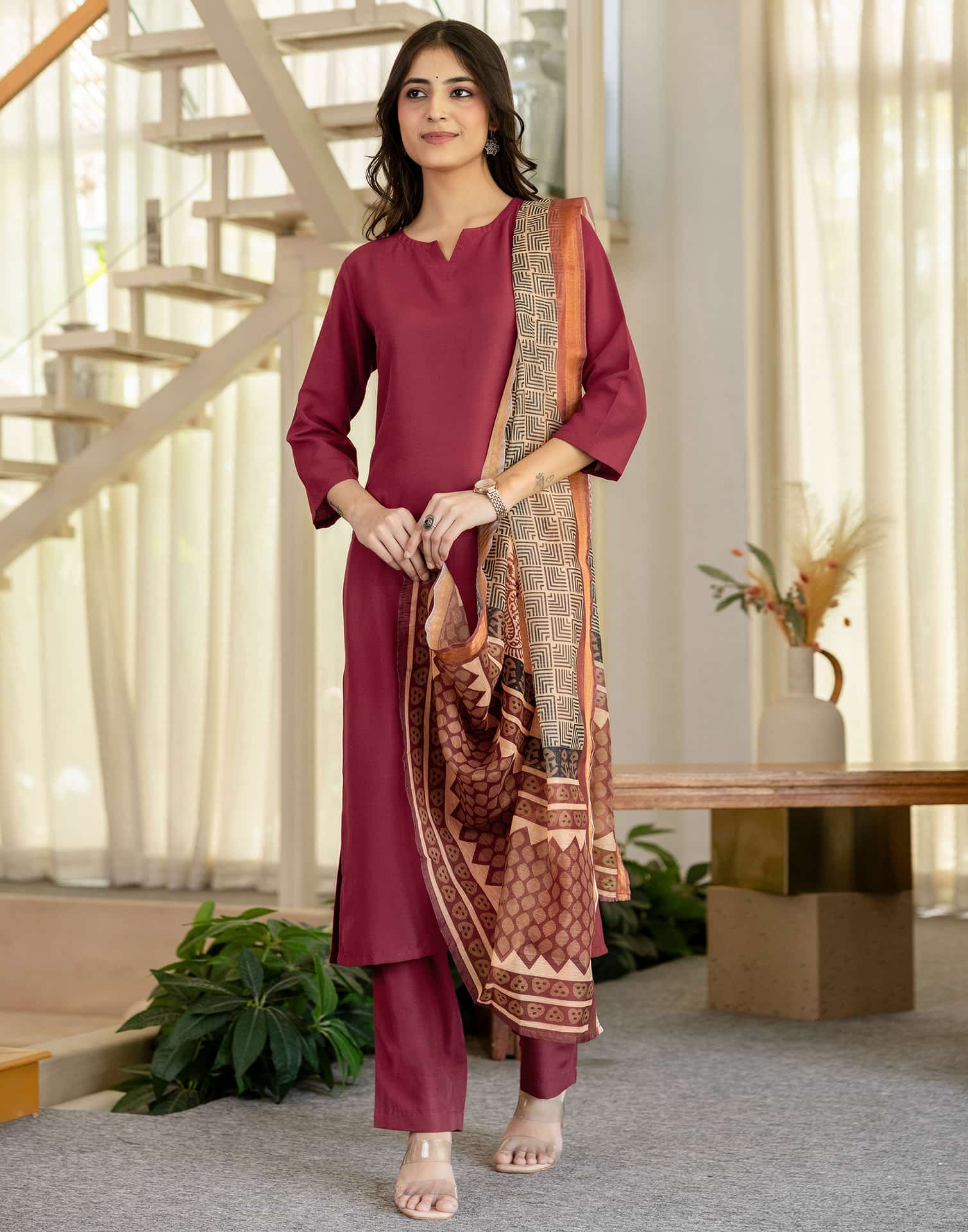 Crafted in Cotton with exquisite Solid, this Maroon kurta set is an essential for your ethnic wardrobe. The kurta comes with a V-Neck, paired with Pant and dupatta for a complete look. Ideal for Festive Wear, it ensures all-day comfort and soft & breathable fabric. A perfect choice for festive wear and traditional outfit lovers. High-quality Fabric, All-day Comfort, Festive Wear.