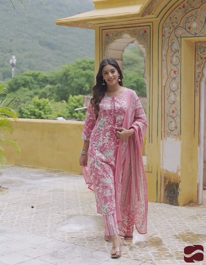 Cotton Straight Printed Keyhole Neck Kurta with Pant & Dupatta