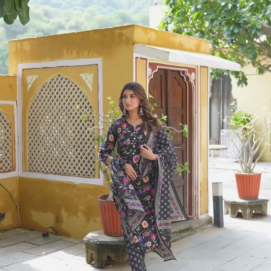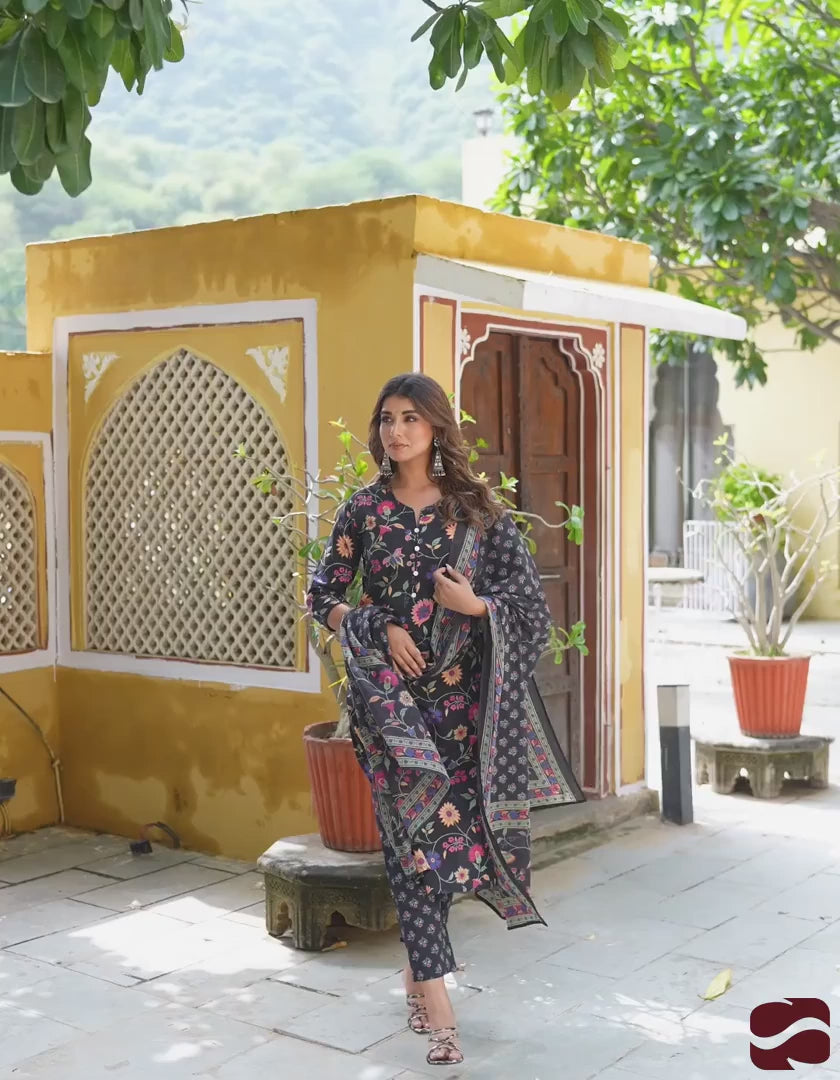 Cotton Straight Printed Round Neck Kurta with Pant & Dupatta