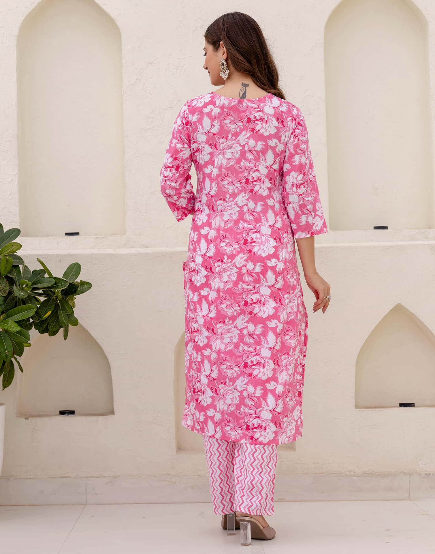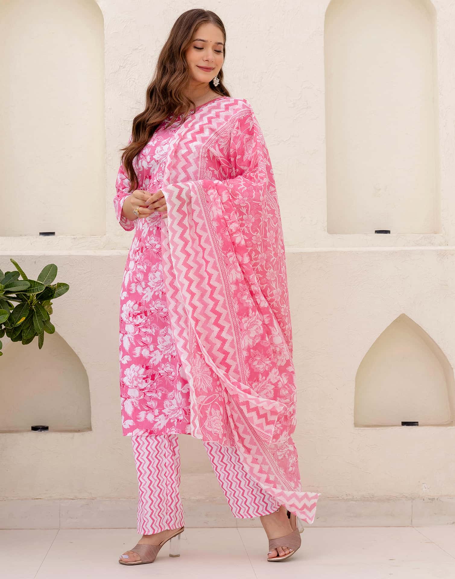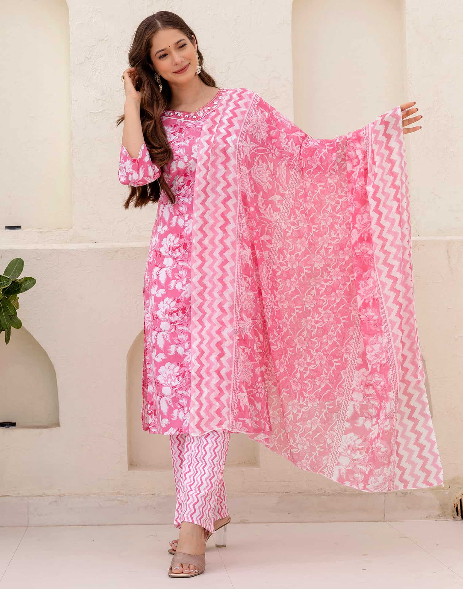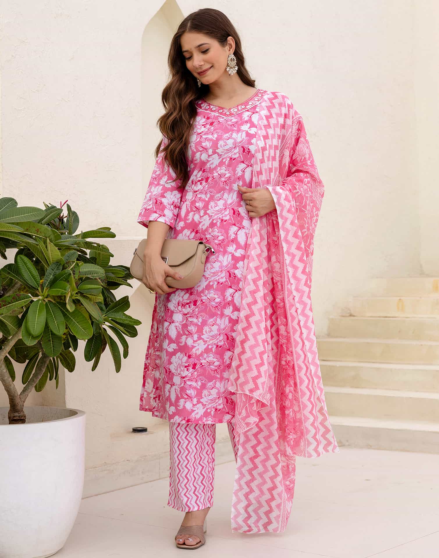Cotton Straight Printed V-Neck Kurta with Pant & Dupatta