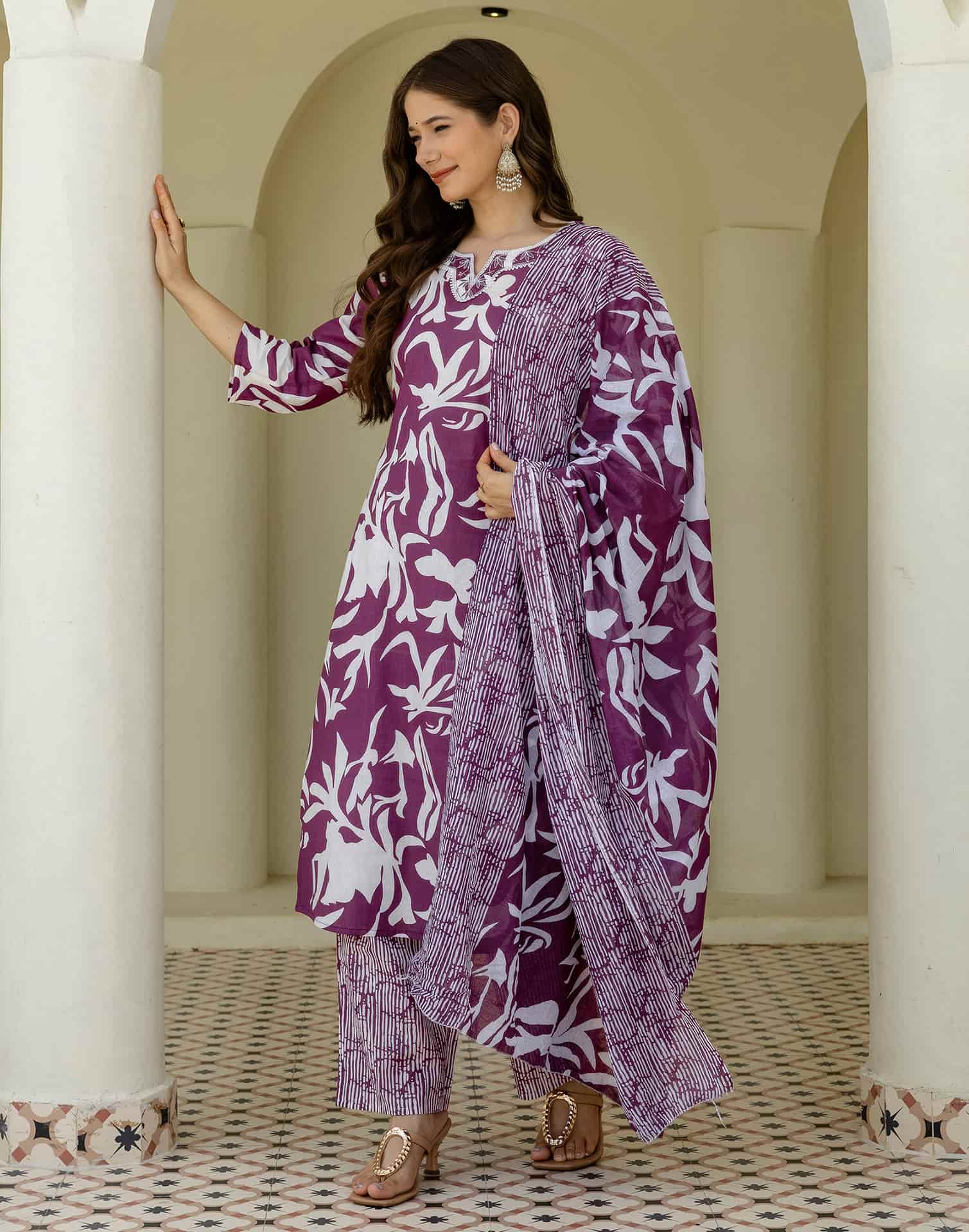 Cotton Straight Printed V-Neck Kurta with Pant & Dupatta