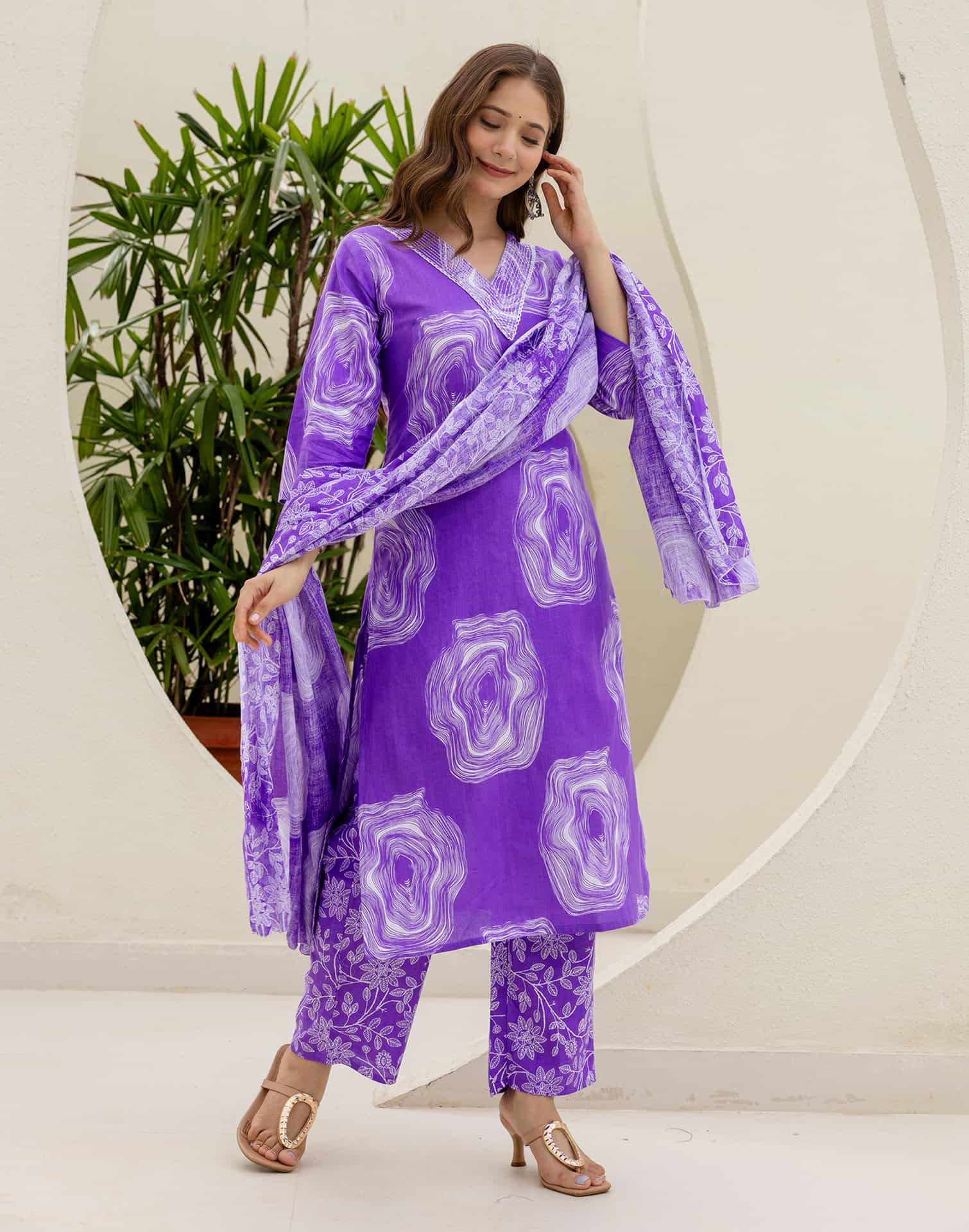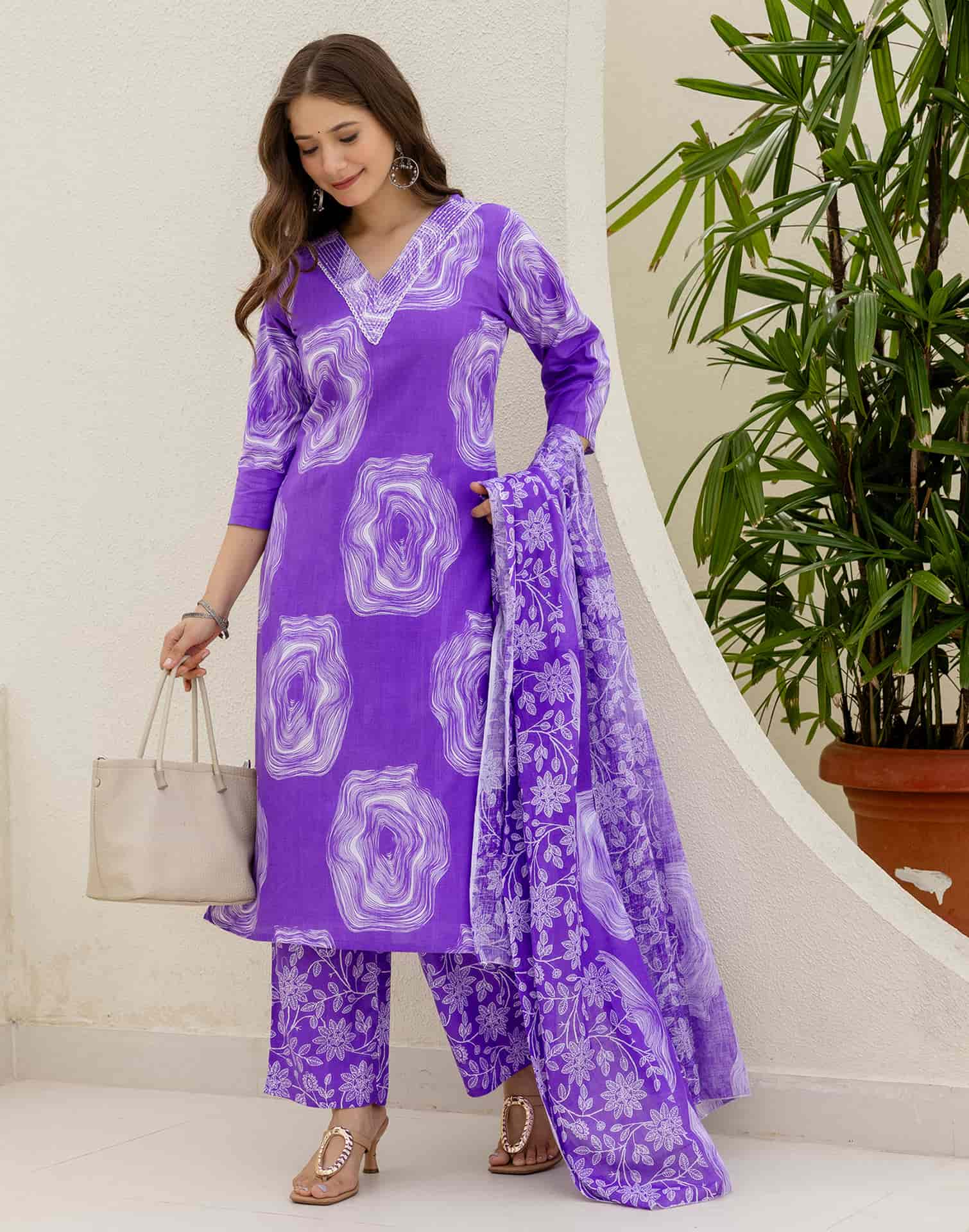 Cotton Straight Printed V-Neck Kurta with Pant & Dupatta