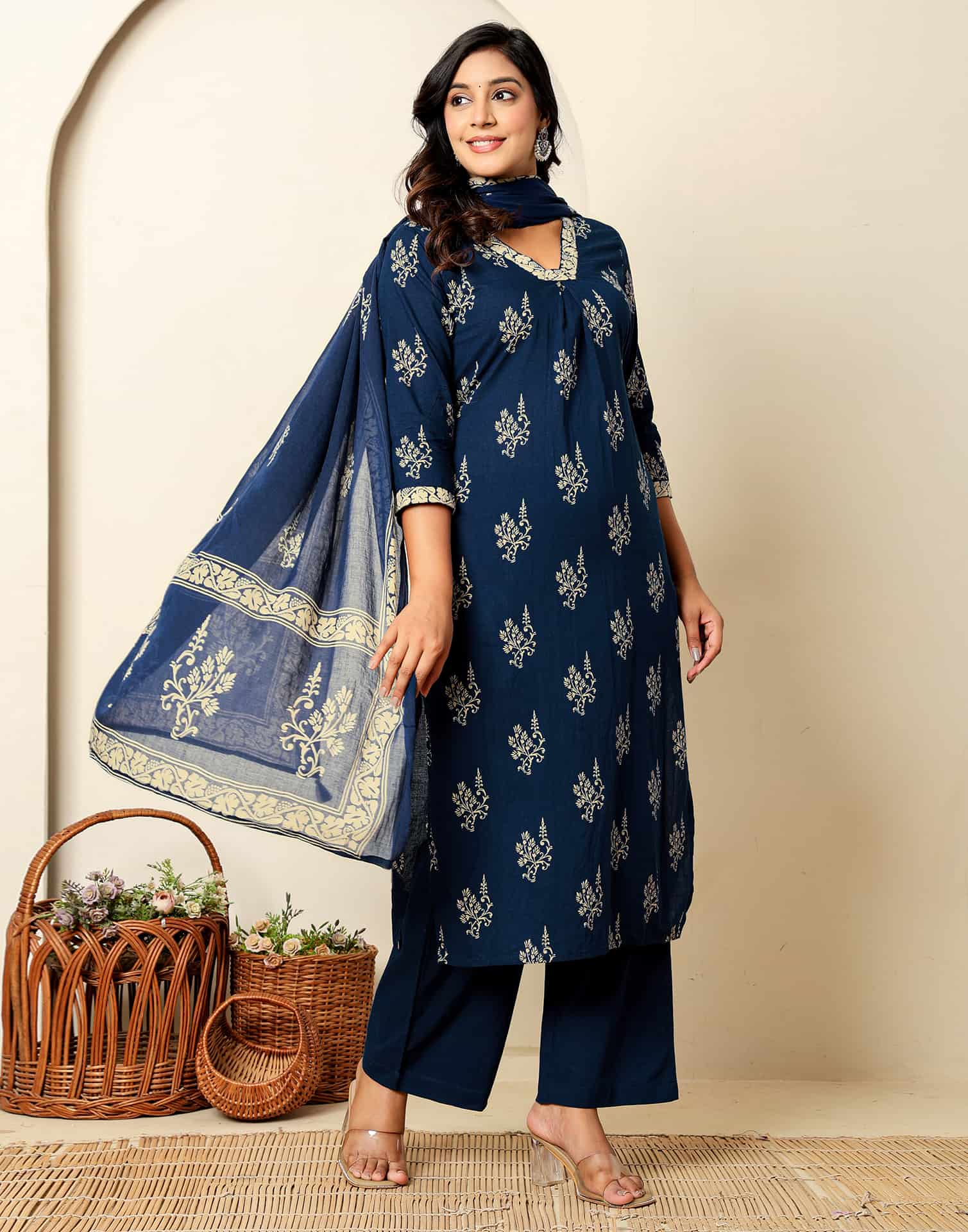 Cotton Straight Printed V-Neck Kurta with Pant & Dupatta