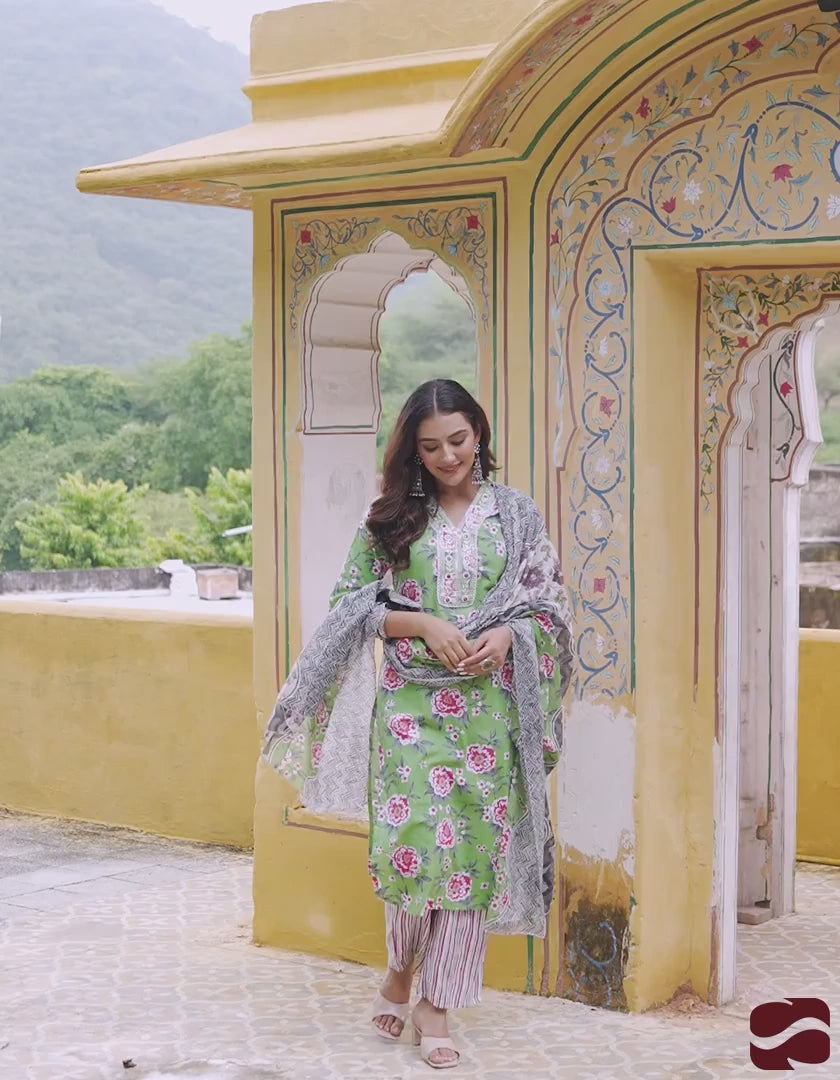 Cotton Straight Printed V-Neck Kurta with Pant & Dupatta