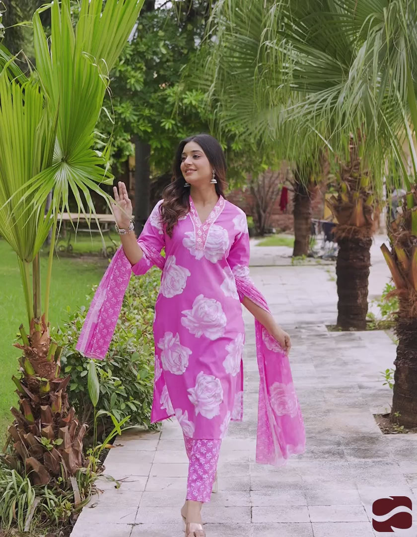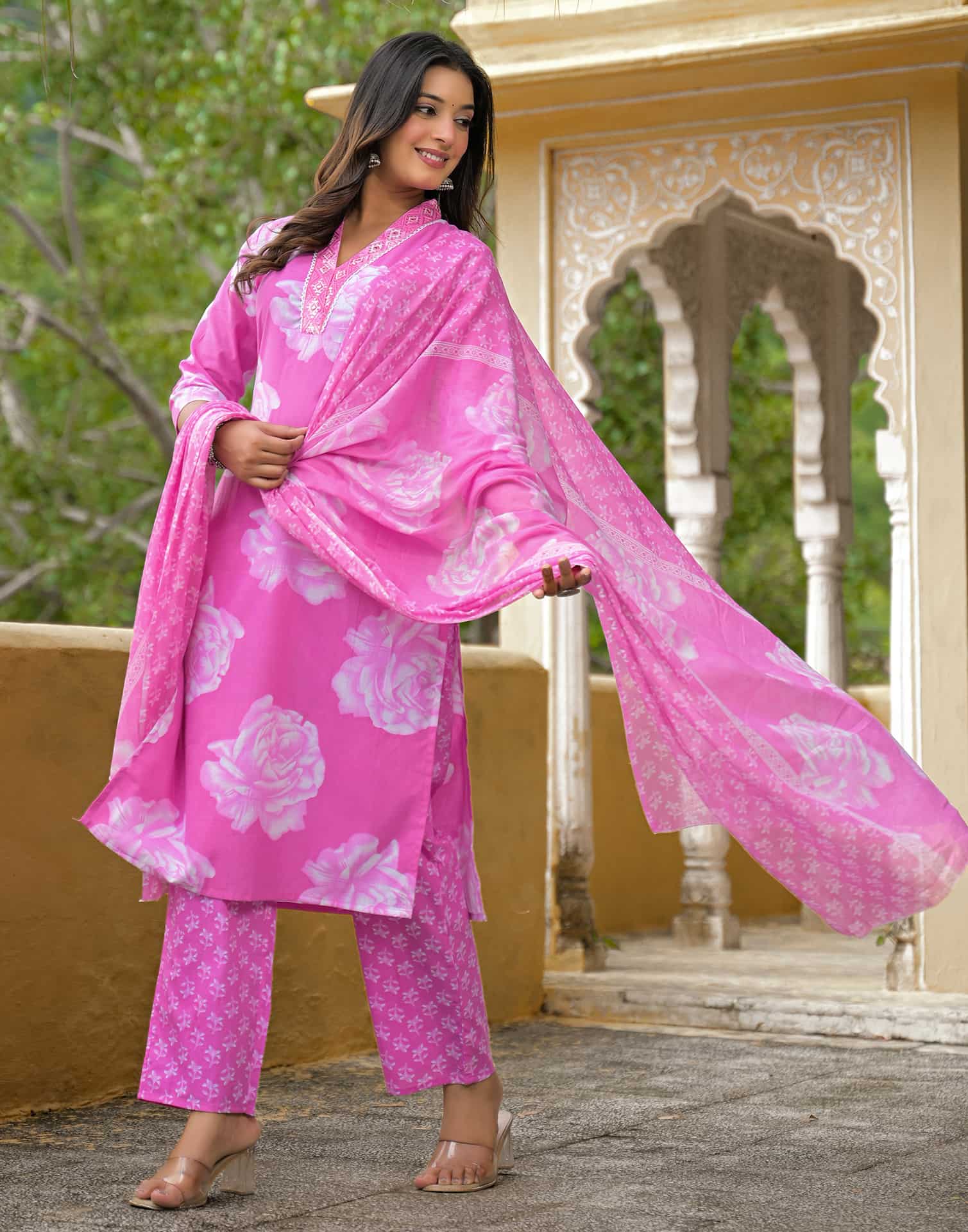 Cotton Straight Printed V-Neck Kurta with Pant & Dupatta