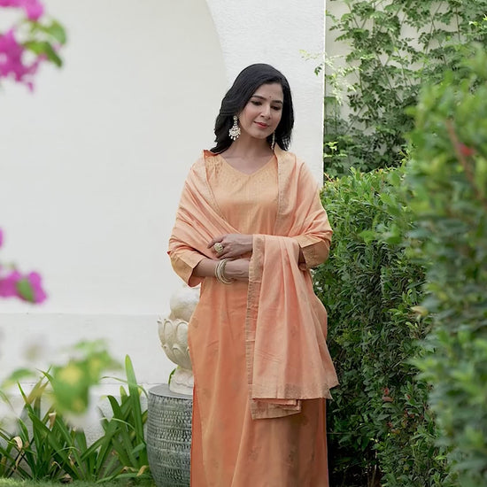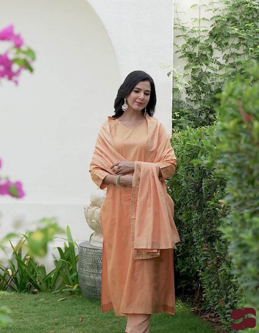 Cotton Straight Woven Design V-Neck Kurta with Pant & Dupatta