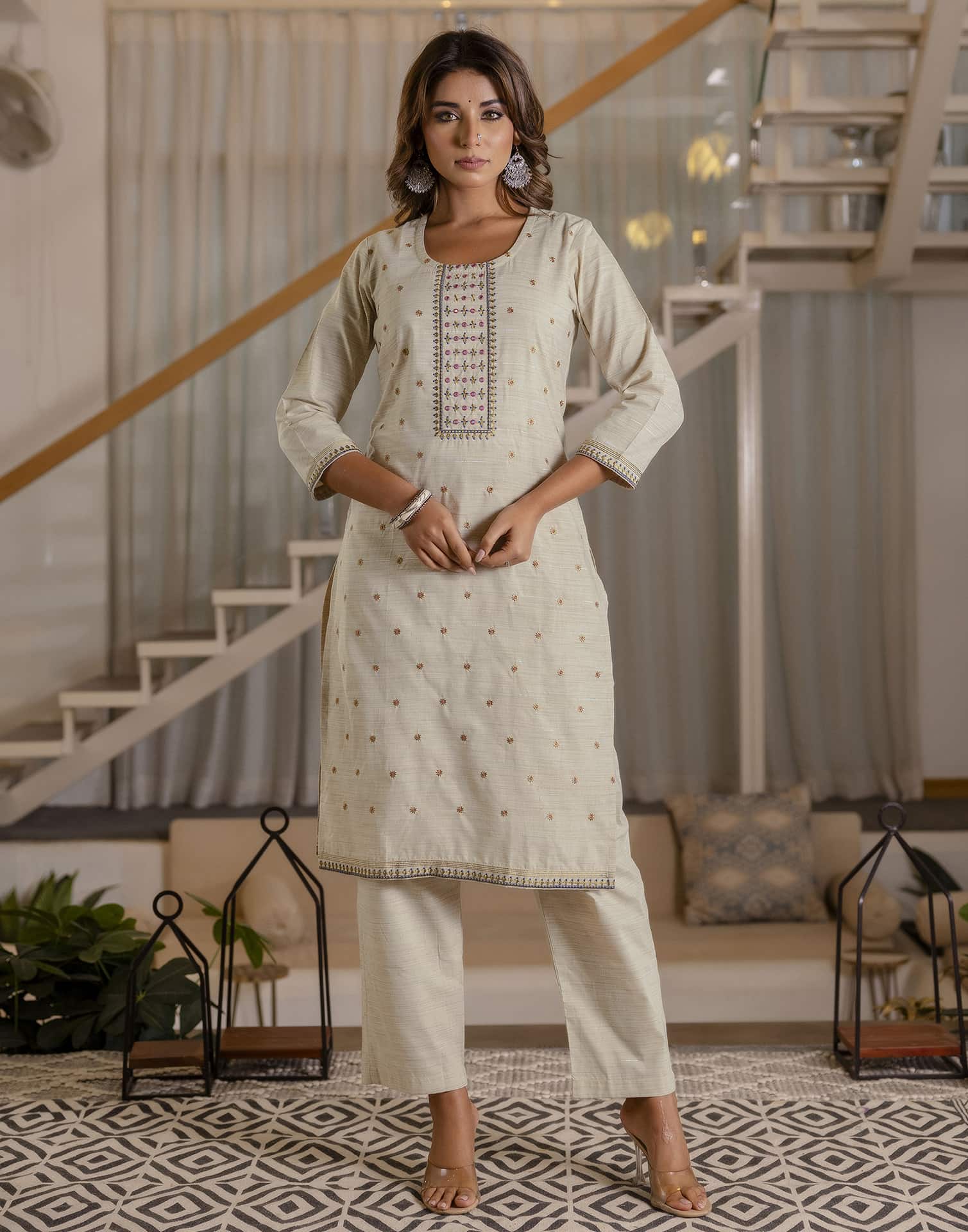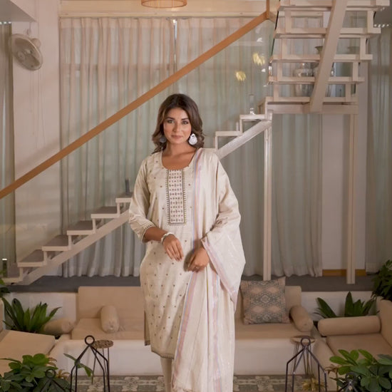 Crafted in Cotton with exquisite Woven Design, this Beige kurta set is an essential for your ethnic wardrobe. The kurta comes with a Round Neck, paired with Pant and dupatta for a complete look. Ideal for Festive Wear, it ensures comfortable wear and high-quality fabric. A perfect choice for festive wear and traditional outfit lovers. Casual Wear, High-quality Fabric, Everyday Wear.