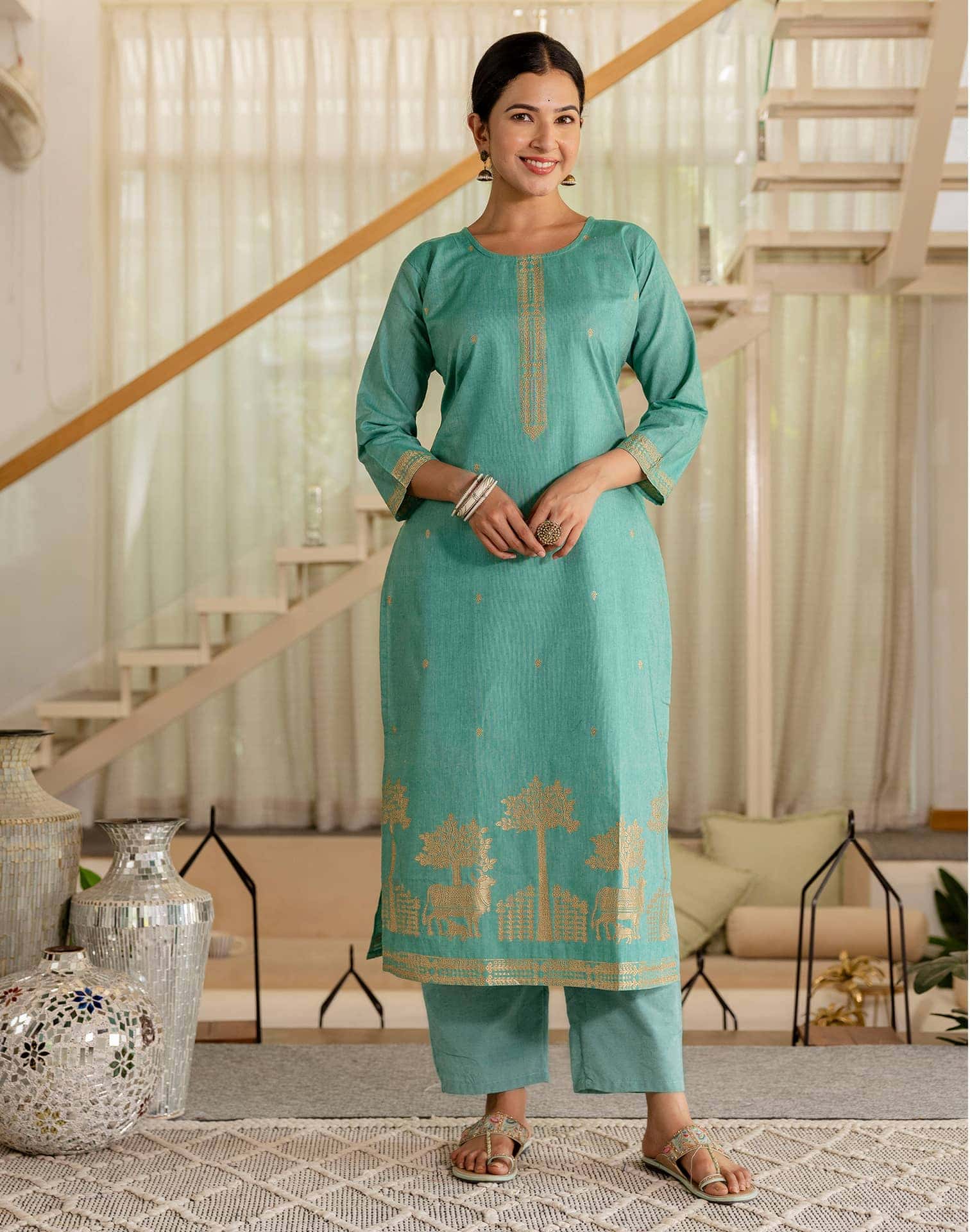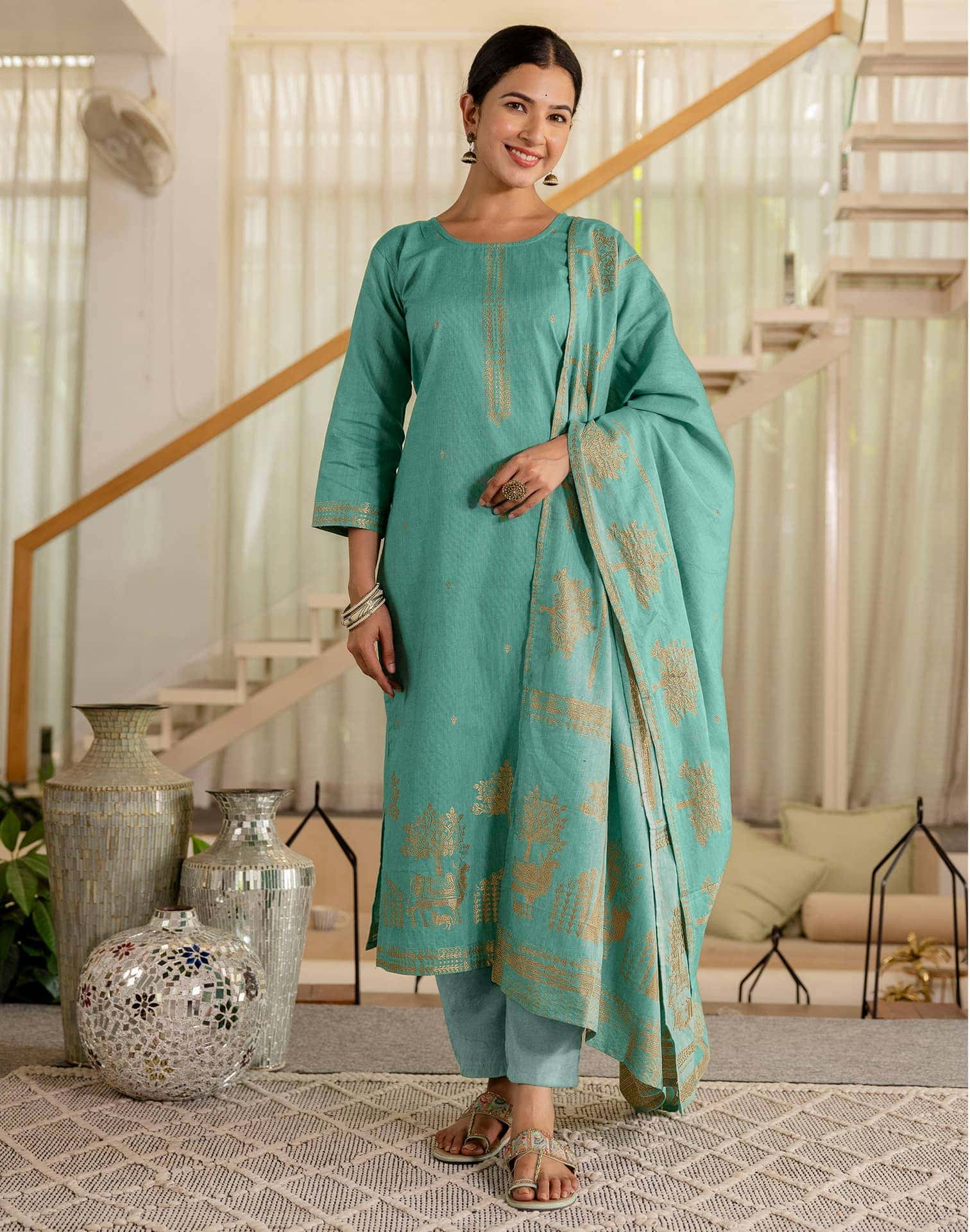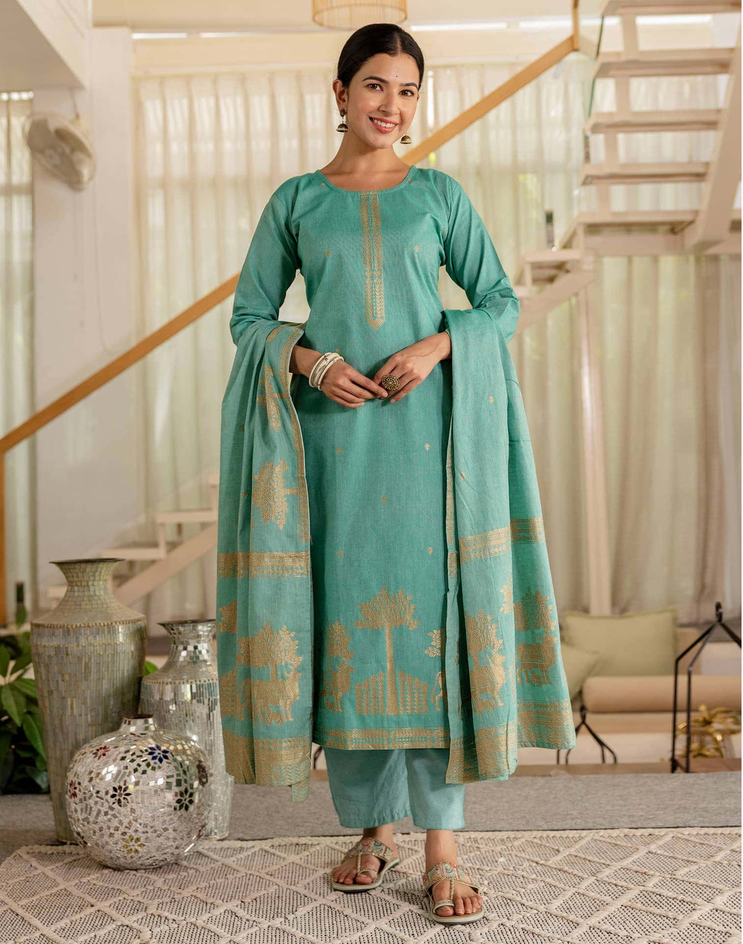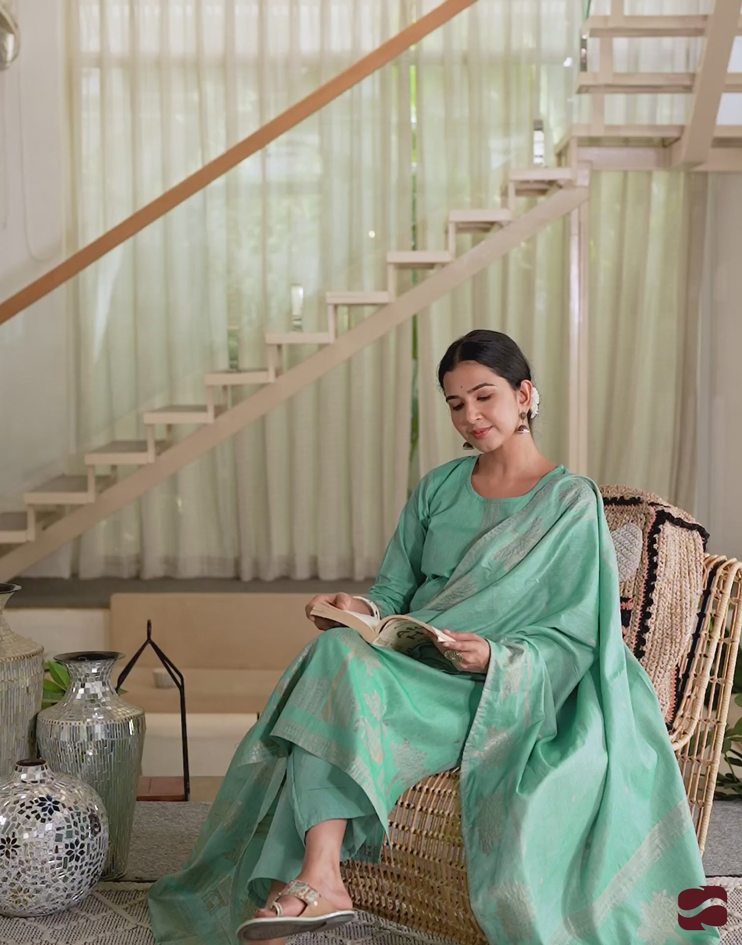 Crafted in Cotton with exquisite Weaving, this Mint Green kurta set is an essential for your ethnic wardrobe. The kurta comes with a Round Neck, paired with Pant With Pocket and dupatta for a complete look. Ideal for Festive Wear, it ensures all-day comfort and lightweight fabric. A perfect choice for festive wear and traditional outfit lovers. Made in India, Indian Wear, Kurta with Pant & Dupatta.
