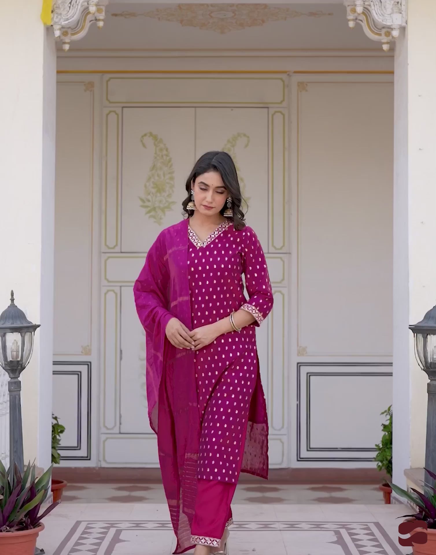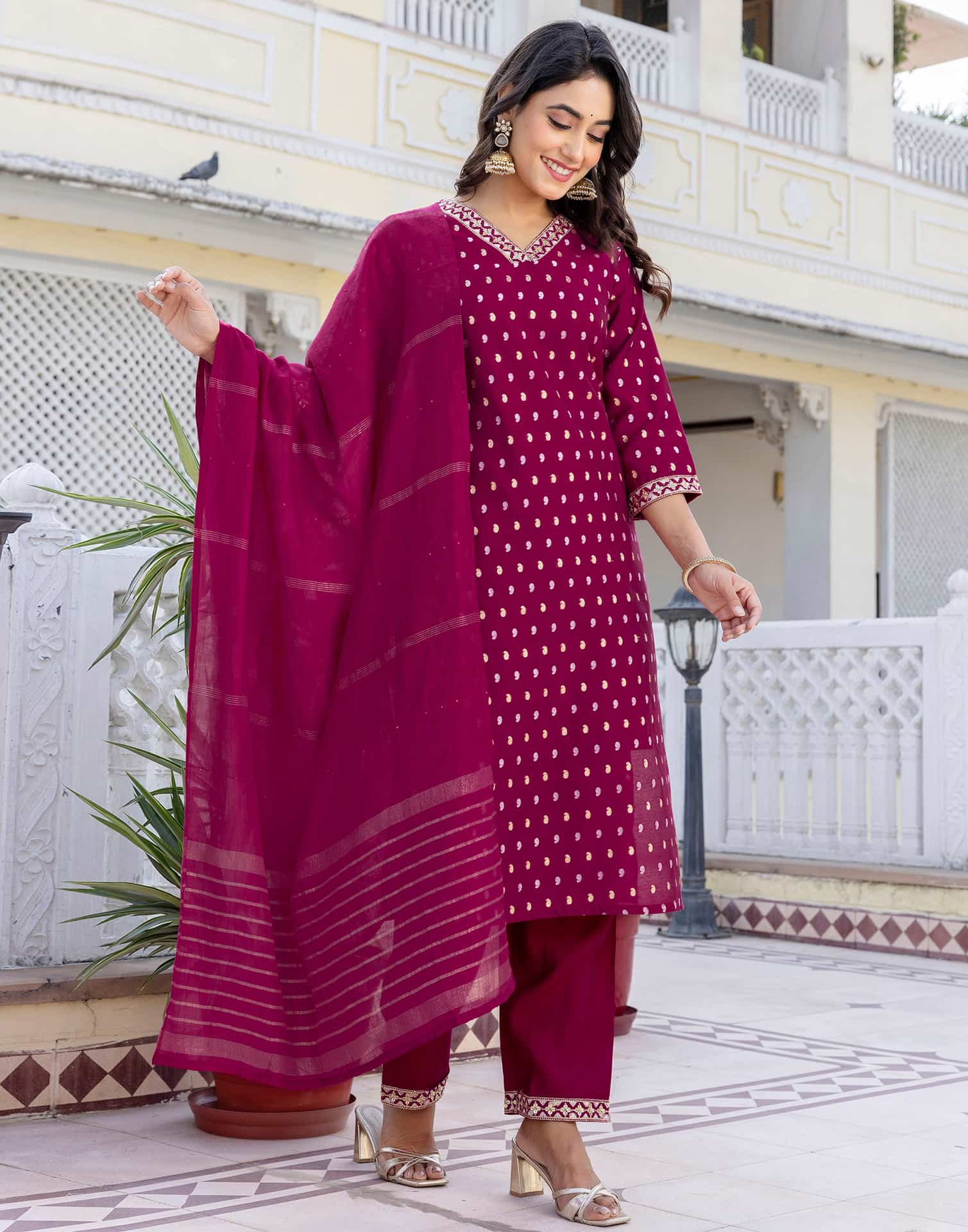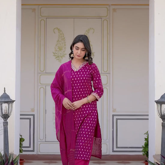 This Purple Cotton kurta set is beautifully designed with Weaving. The kurta features a V-Neck and a graceful silhouette for an elegant appeal. It is paired with Pant and a matching dupatta, making it a complete kurta set. Perfect for Festive Wear, this ethnic wear for women offers premium fabric, all-day comfort, and timeless charm. Comfortable Wear, Matching Bottoms, Ethnic Wear for Women.