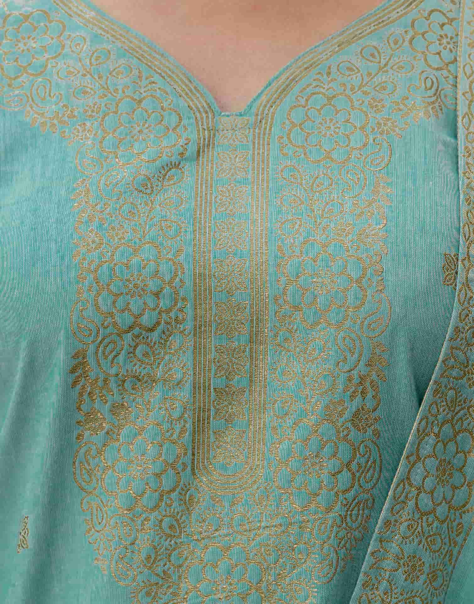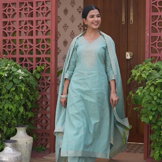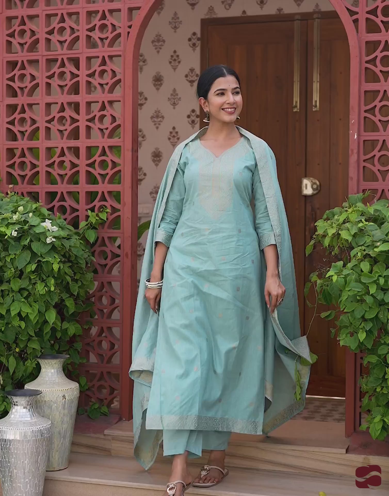 Bring elegance to every occasion with this Light Blue Cotton kurta set. Featuring Weaving on the kurta and a V-Neck, it radiates traditional charm. Styled with Pant and dupatta, this outfit is ideal for Festive Wear. Its premium fabric ensures breathability and ease of movement, while the dupatta adds a touch of grace. Soft & Breathable Fabric, Family Function Wear, Elegant Dupatta.