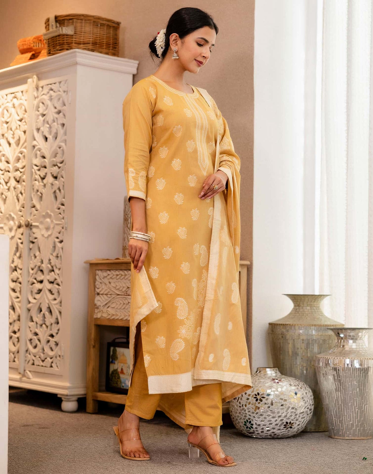 Step into sophistication with this Yellow Cotton kurta set adorned with Weaving. The kurta features a Round Neck for a refined look, paired with Pant and dupatta. Perfect for Festive Wear, it delivers ease of movement, lightweight fabric, and effortless style. Everyday Wear, Kurta with Pant & Dupatta, Graceful Silhouette.