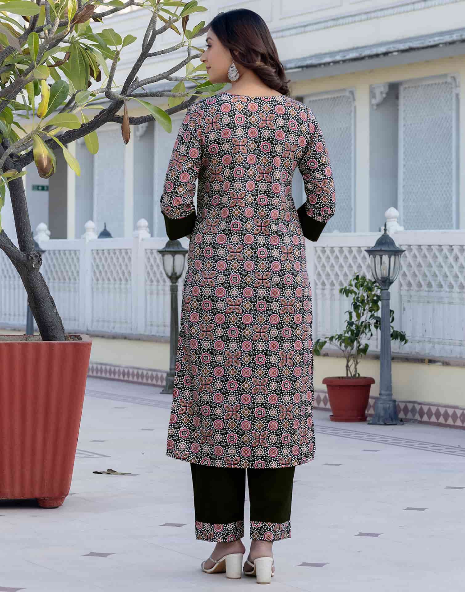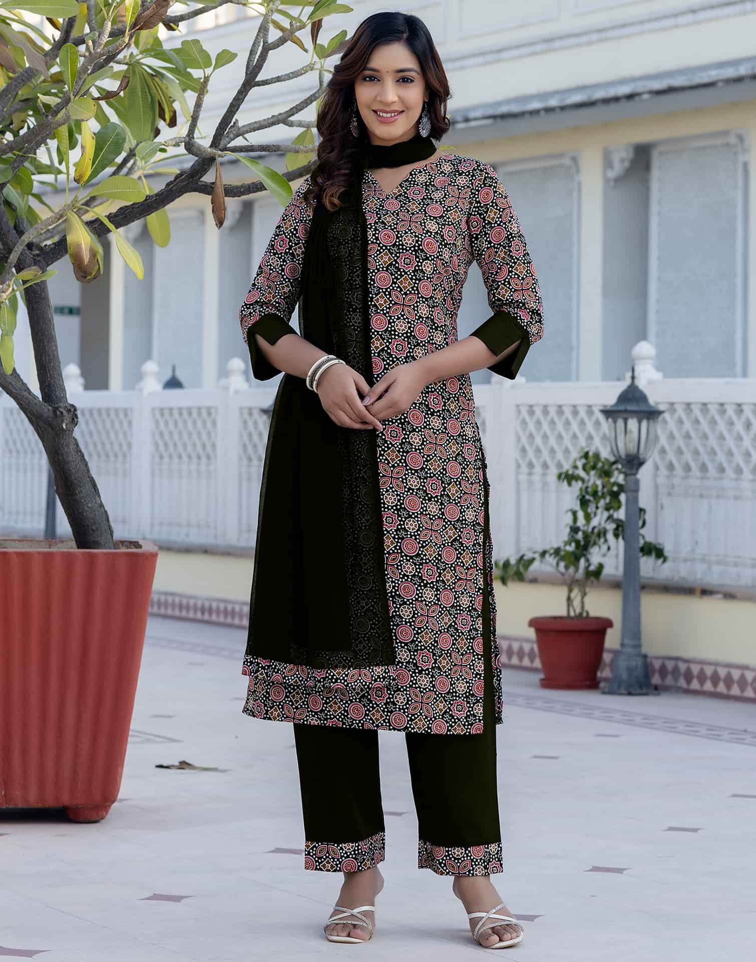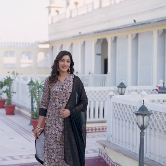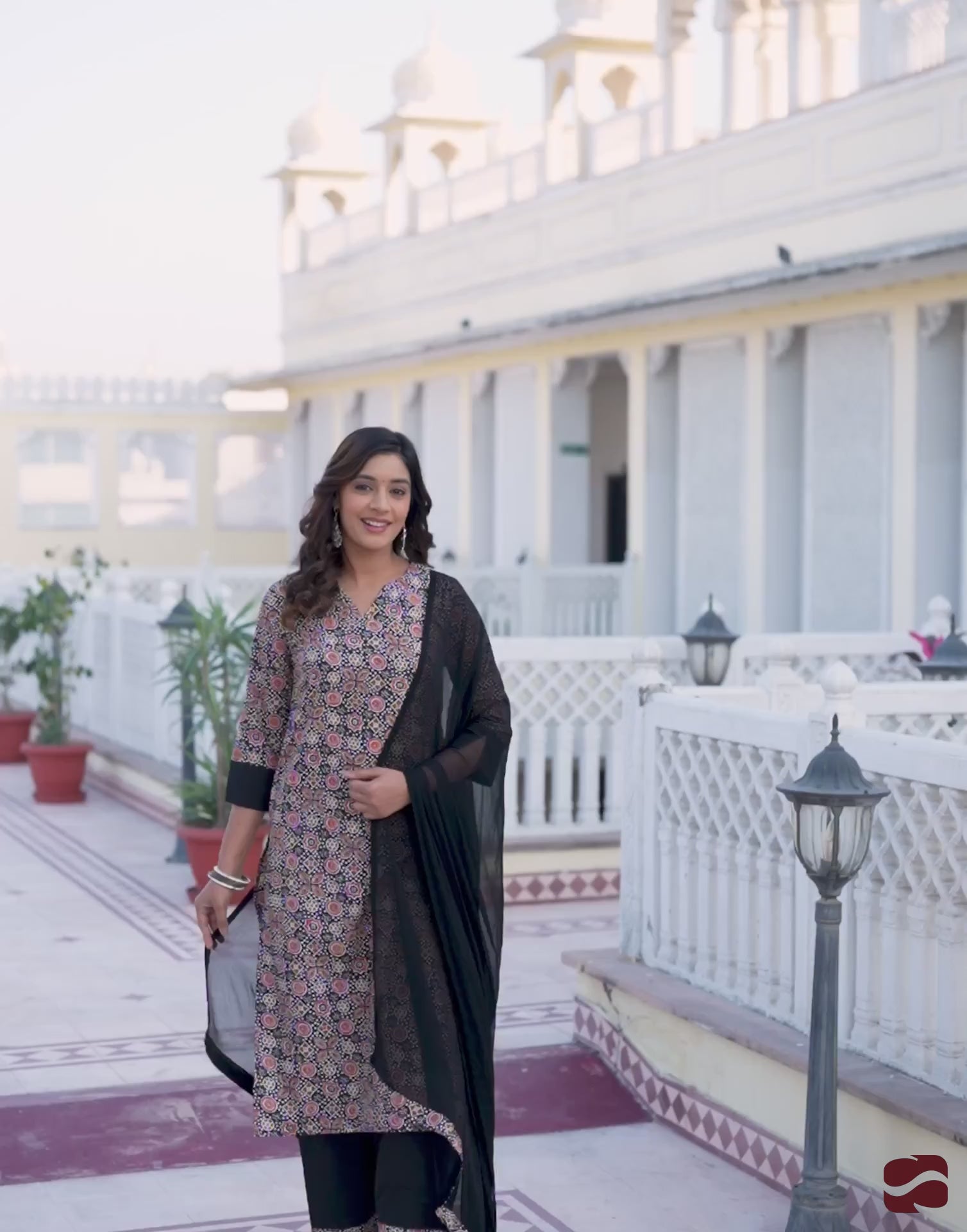 Bring elegance to every occasion with this Black Crepe kurta set. Featuring Printed on the kurta and a V-Neck, it radiates traditional charm. Styled with Pant and dupatta, this outfit is ideal for Festive Wear. Its premium fabric ensures breathability and comfortable wear, while the dupatta adds a touch of grace. Ethnic Wear for Women, Semi-formal Wear, All-day Comfort.