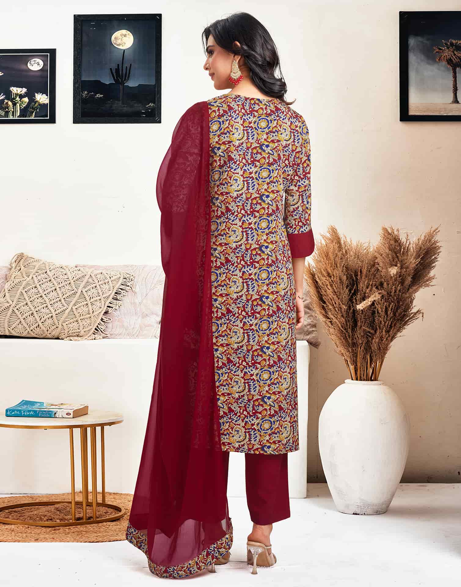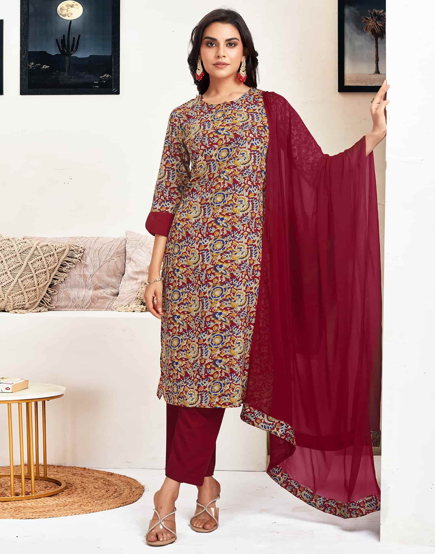 This Red Crepe kurta set with Printed is crafted for women who love Indian wear with a modern twist. The kurta’s Round Neck and graceful cut enhance its style, while Pant and dupatta complete the ensemble. Designed for Festive Wear, it promises lightweight fabric, comfortable wear, and lasting appeal. Breathable Kurta, Soft & Breathable Fabric, Family Function Wear.