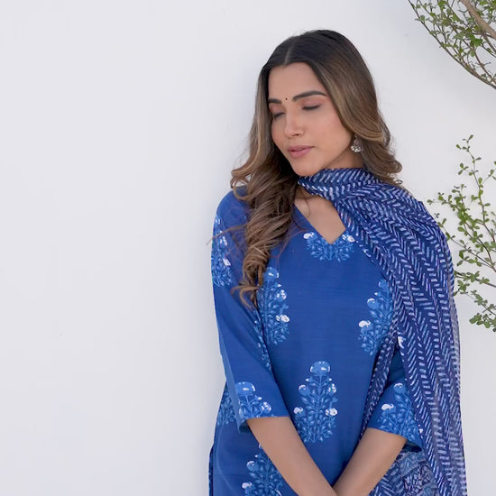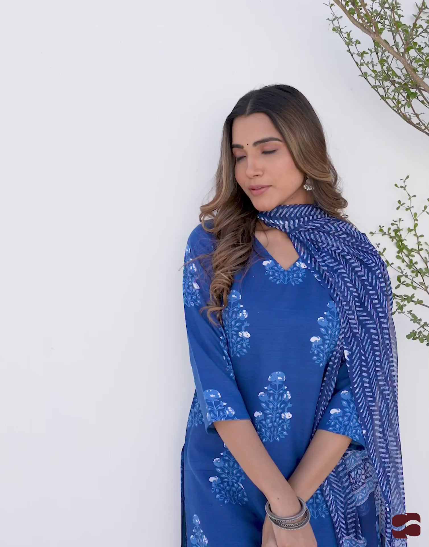 Bring elegance to every occasion with this Dark Blue Cotton Slub kurta set. Featuring Printed on the kurta and a V Neck, it radiates traditional charm. Styled with Pant With Pocket and dupatta, this outfit is ideal for Everyday Wear. Its high-quality fabric ensures breathability and ease of movement, while the dupatta adds a touch of grace. Festive Wear, Kurta with Pant & Dupatta, Comfortable Fit.
