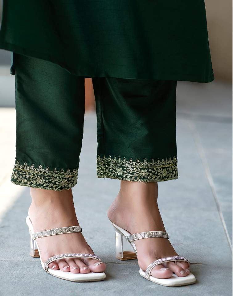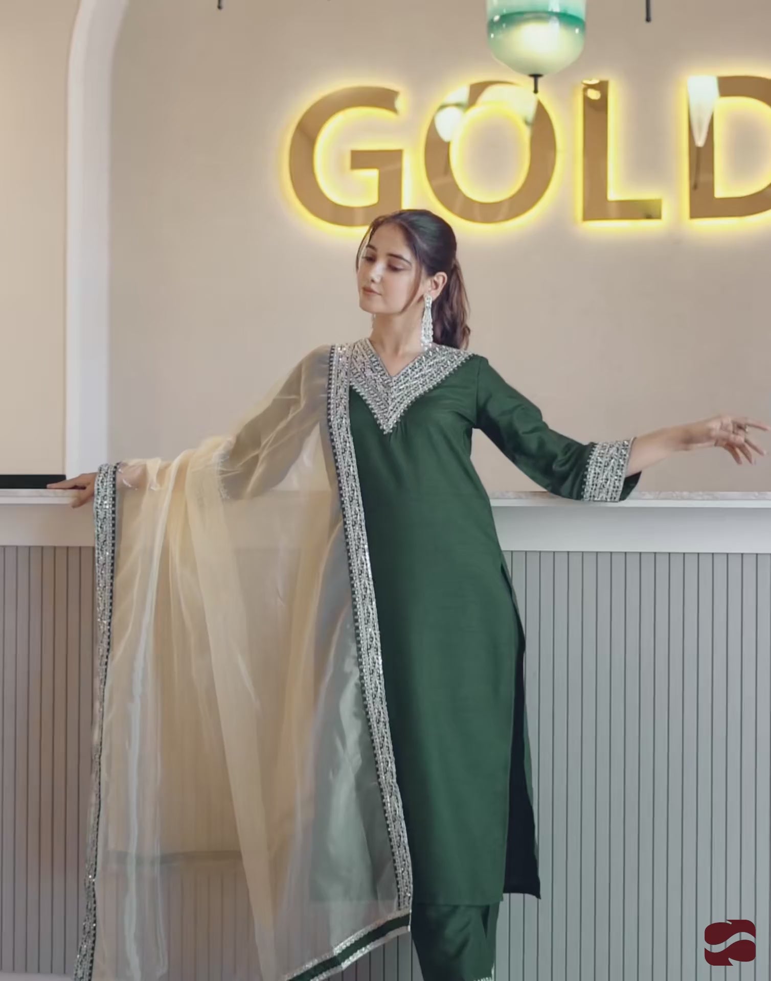 Step into sophistication with this Dark Green Silk kurta set adorned with Plain. The kurta features a V Neck for a refined look, paired with Pant With Pocket and dupatta. Perfect for Festive Wear, it delivers comfortable wear, soft & breathable fabric, and effortless style. Kurta with Pant & Dupatta, Festive Wear, Breathable Kurta.